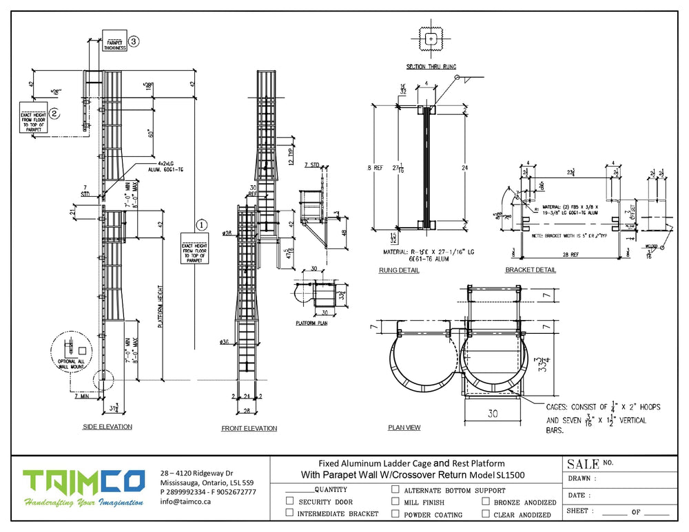 - Superior Safety: Taimco’s ladder cages are constructed from high-strength aircraft-grade aluminum alloy and Steel, ensuring robust structural stability. The cages feature 1/4” x 2” hoops riveted to seven 3/16” x 1-1/2” vertical bars, providing optimal support.