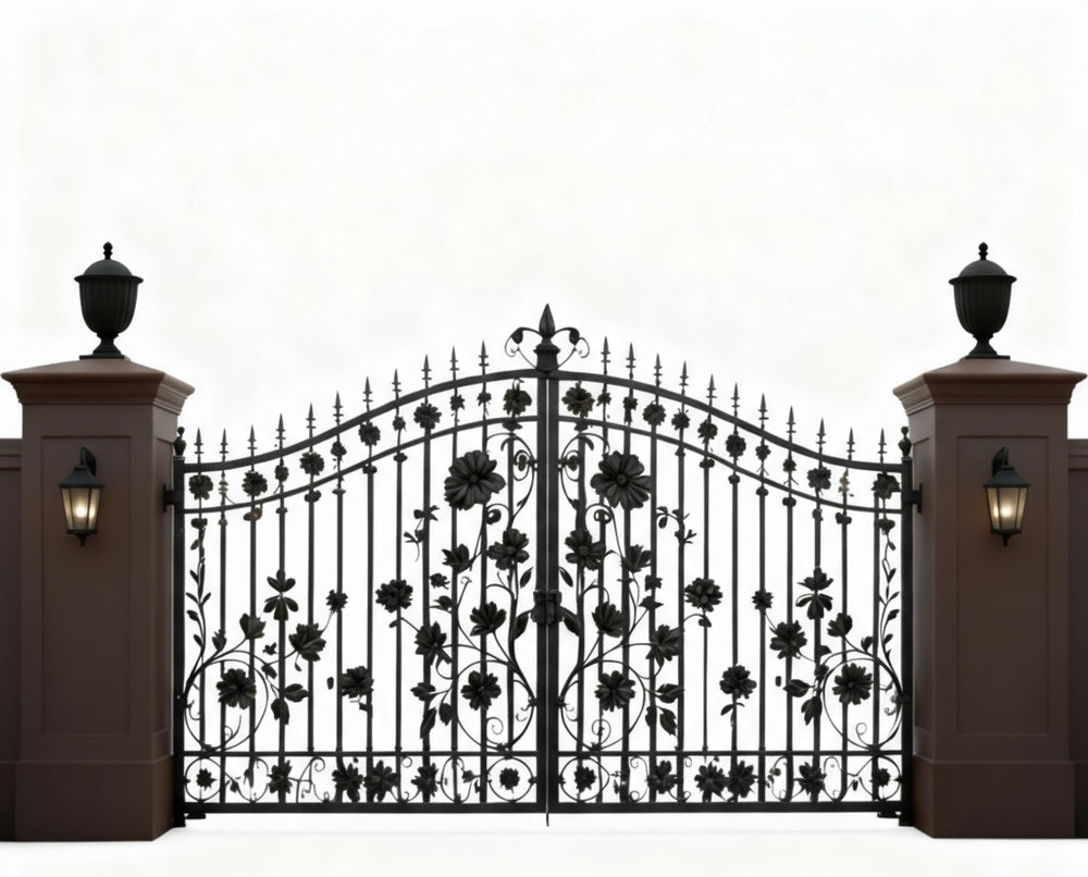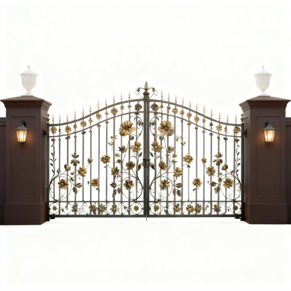 Let your entrance bloom with prestige. Fleur Royale features dual swing panels adorned with mirrored floral and vine motifs, crowned by pointed finials and a central fleur-de-lis emblem. The gate’s ornamental ironwork evokes classical garden architecture, while the flanking pillars—topped with urns and lanterns—anchor the design in timeless sophistication. Ideal for estates that blend botanical beauty with architectural formality.