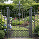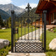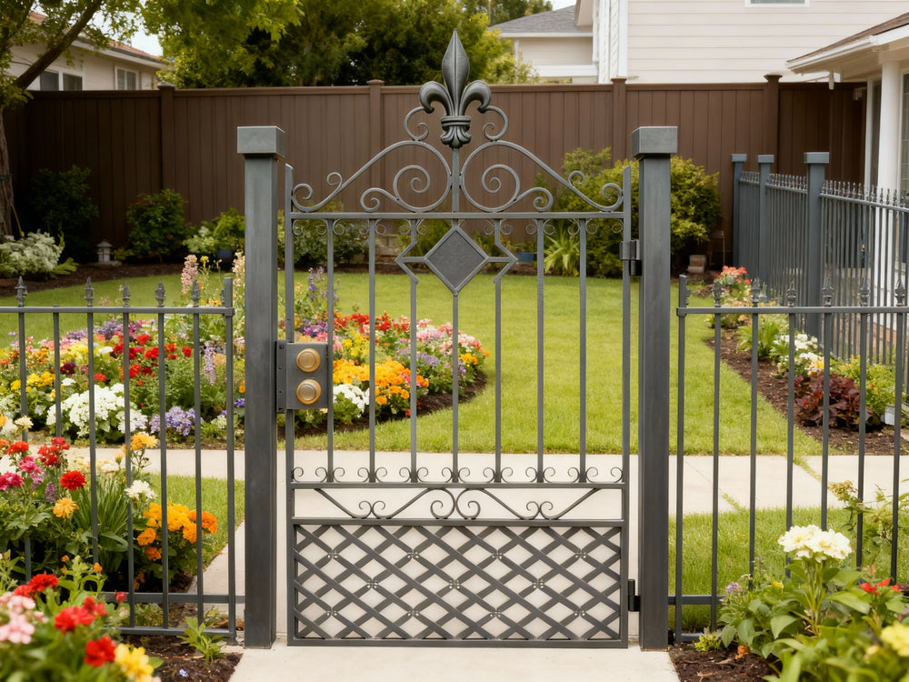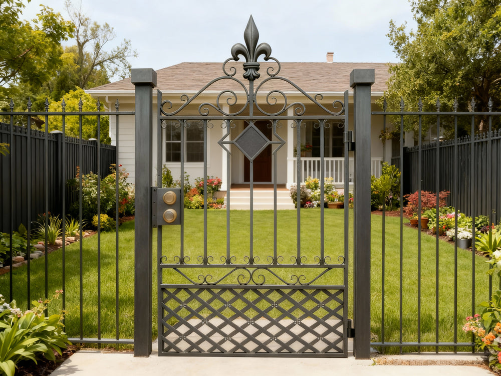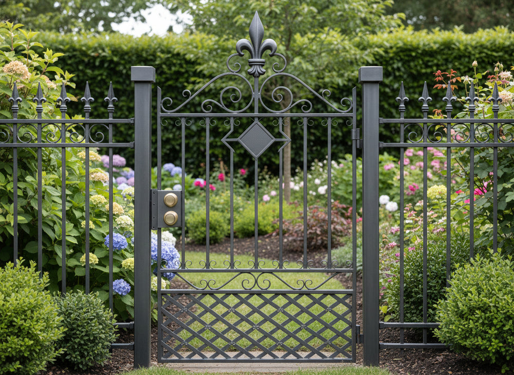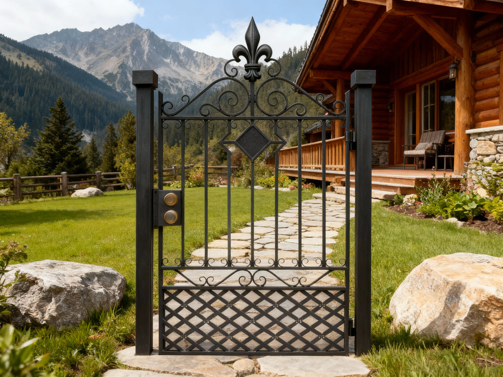 A door that blends classical symbolism with geometric elegance. Fleurgrid Passage features vertical bars crowned by a central fleur-de-lis finial, flanked by symmetrical scrollwork. A diamond-shaped centerpiece anchors the midsection, while the lower portion showcases a crisscross lattice framed by ornamental scrolls. Ideal for estate entries, garden transitions, or decorative side gates that combine security with timeless artistry.