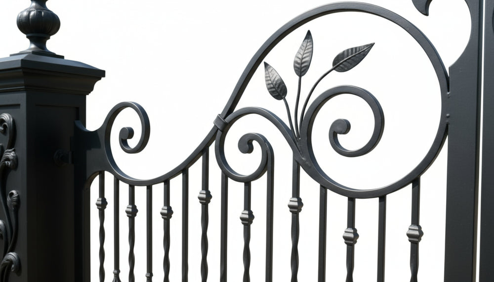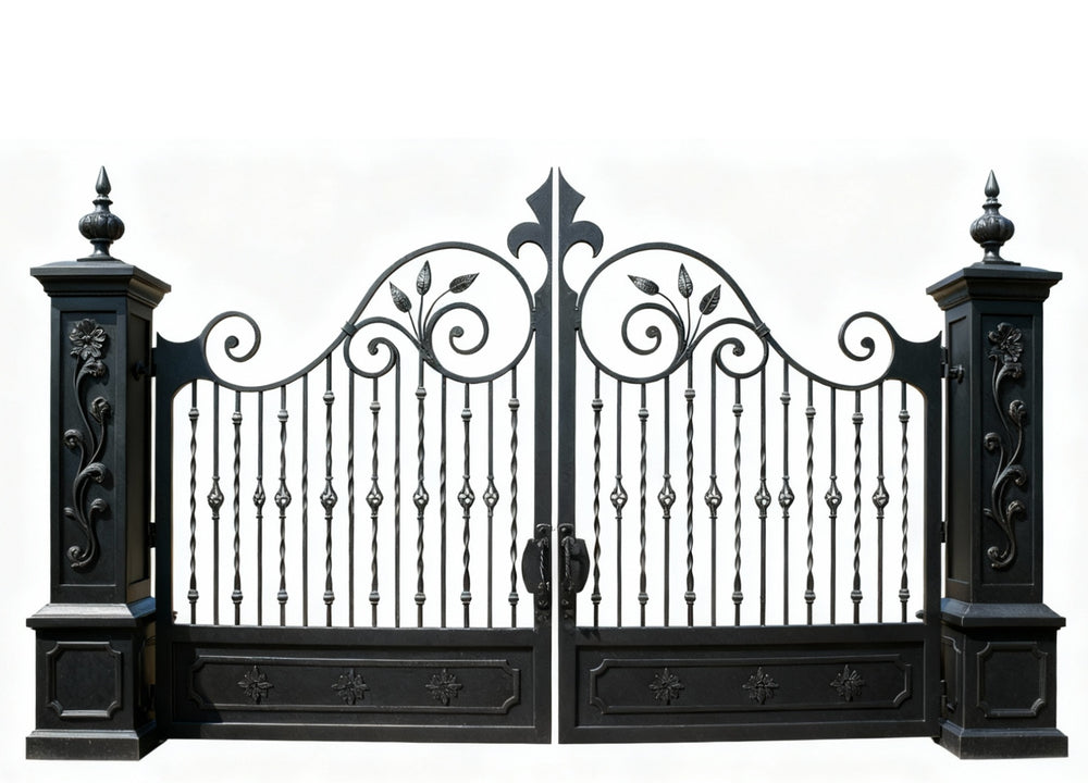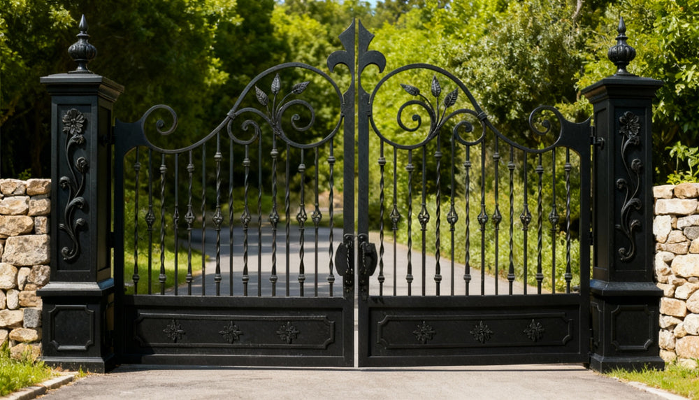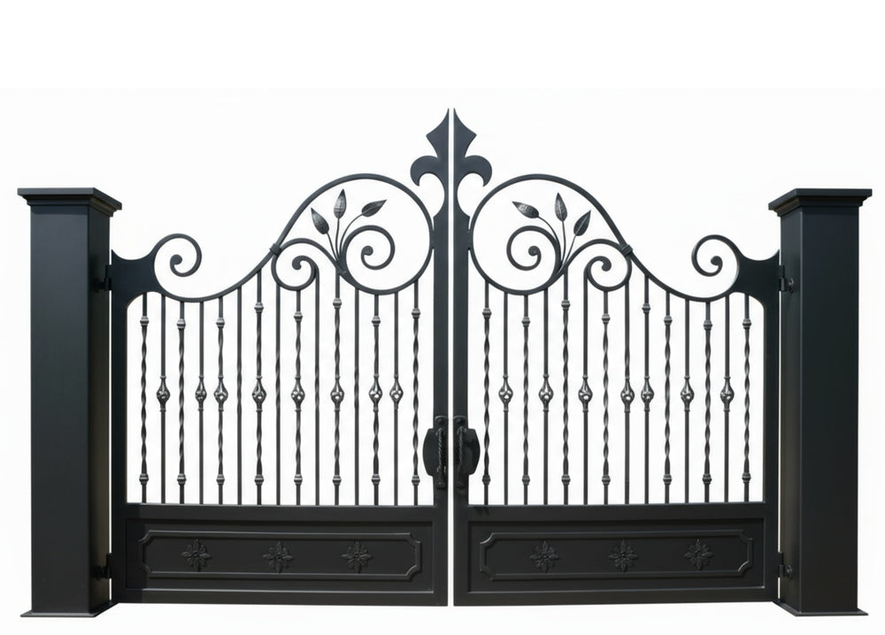 - Custom Crest: Optional monogram or estate emblem engraving, fleur-de-lis wrought iron gate, diamond bar estate gate, leaf scroll driveway gate, Canadian custom gate, Taimco decorative gate, luxury property gate, nature-inspired ornamental gate, heavy-duty artistic gate design
