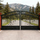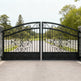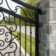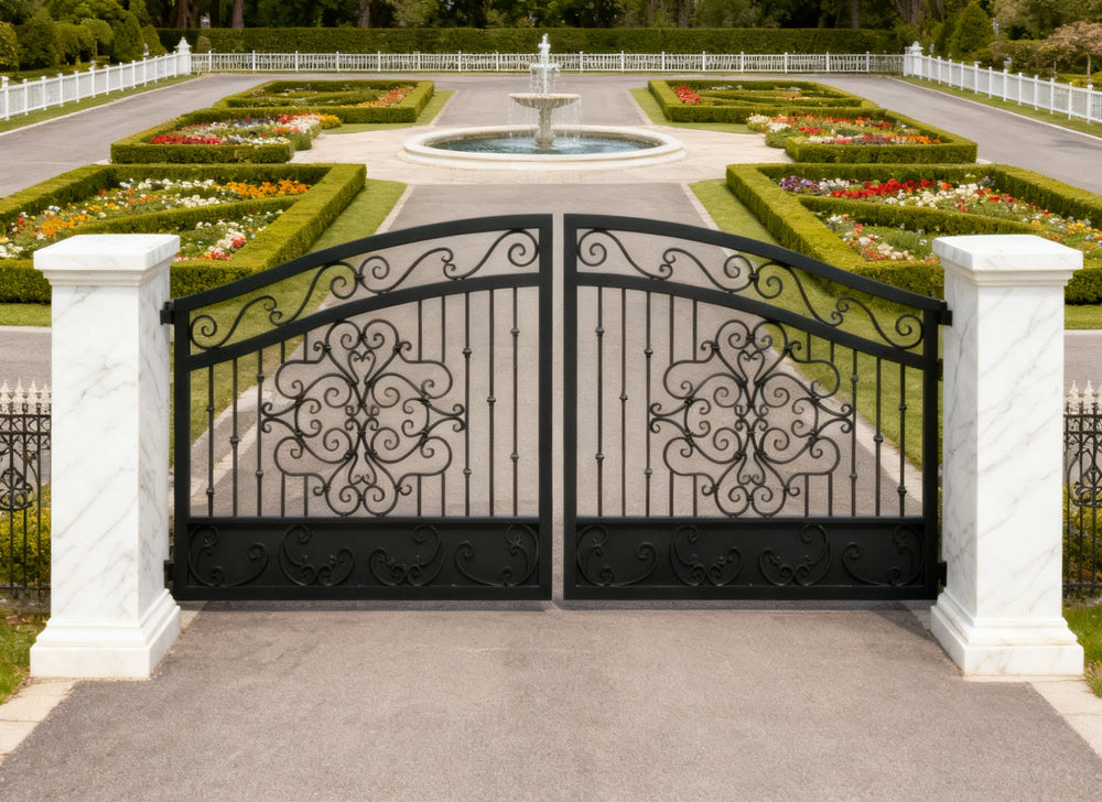floral scroll wrought iron gate, arched estate gate, stone pillar entrance gate, Canadian custom gate, Taimco decorative gate, heritage property gate, heavy-duty ornamental gate, luxury driveway gate design