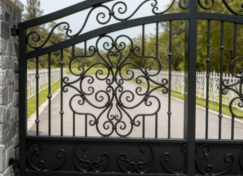 A gate that greets with grace and grandeur. Floracurve Estate features dual swing panels adorned with intricate scrollwork and symmetrical floral motifs, crowned by a curved top rail with pointed finials. The vertical bars provide structure and security, while the flanking stone pillars—built from multi-toned rectangular masonry and capped with flat stones—anchor the design in rustic sophistication. This gate evokes timeless elegance and architectural refinement.