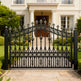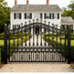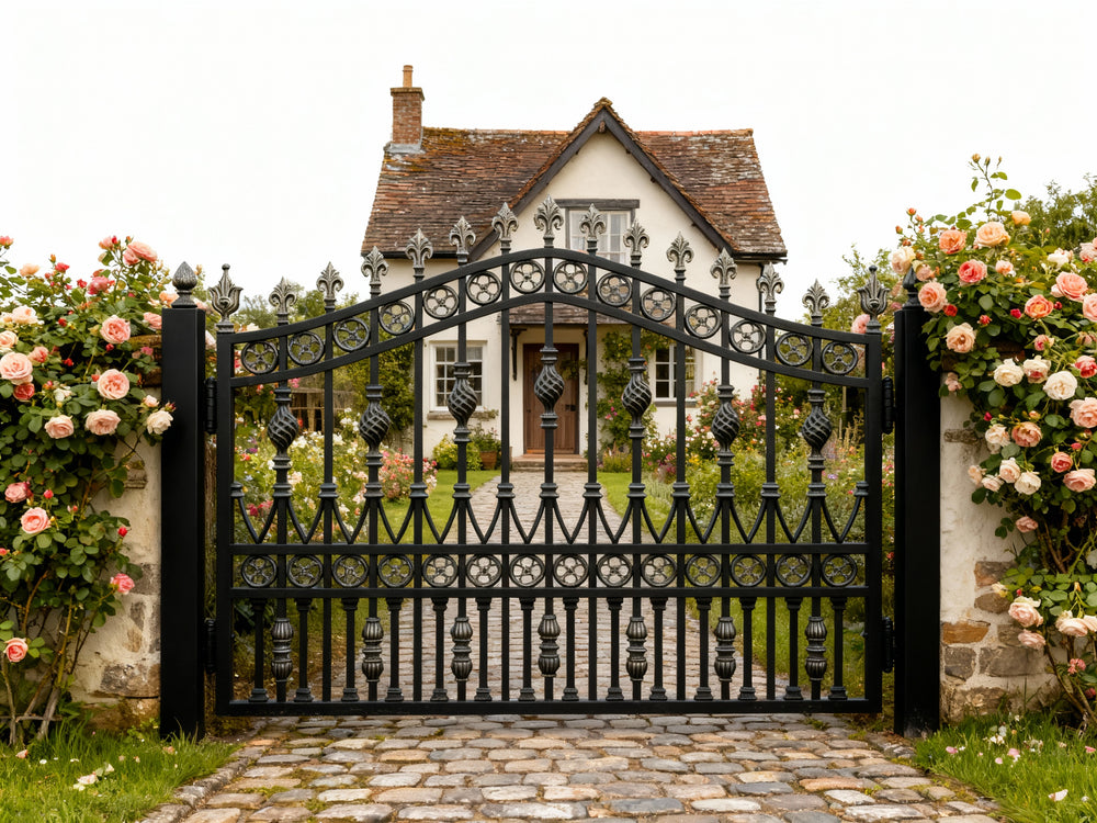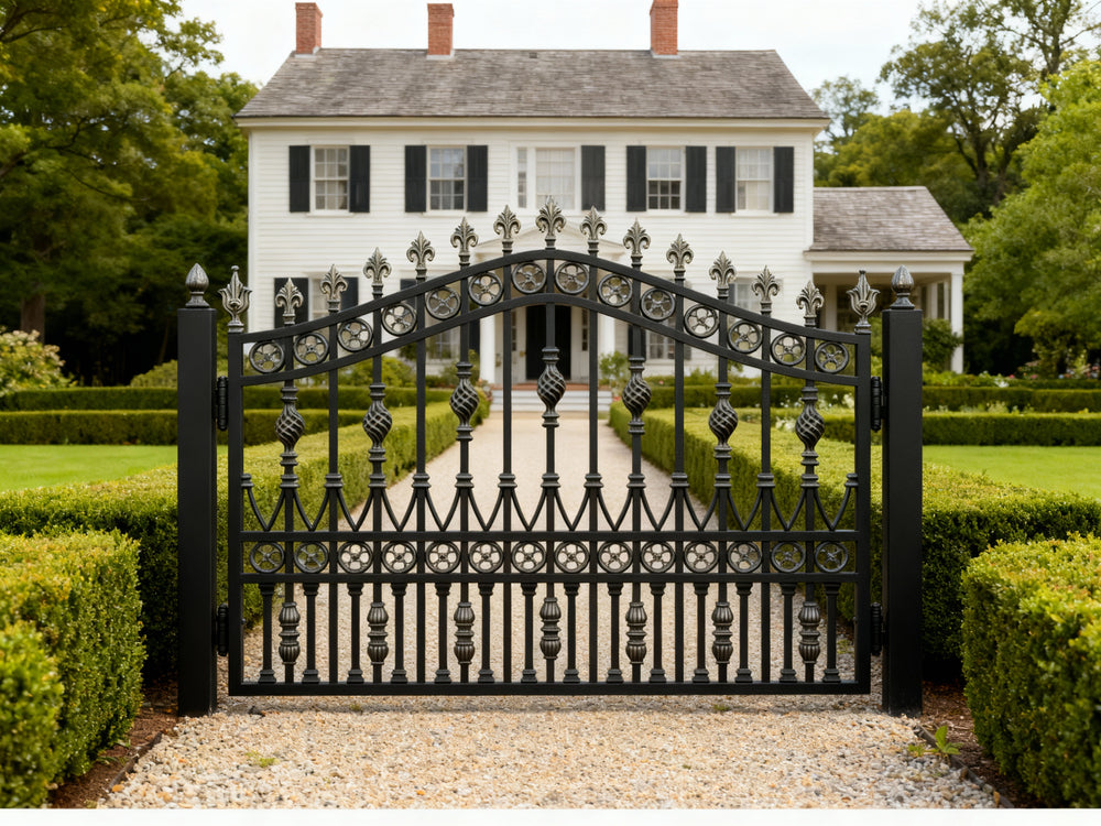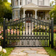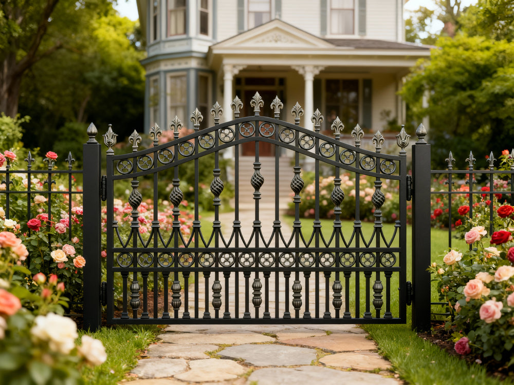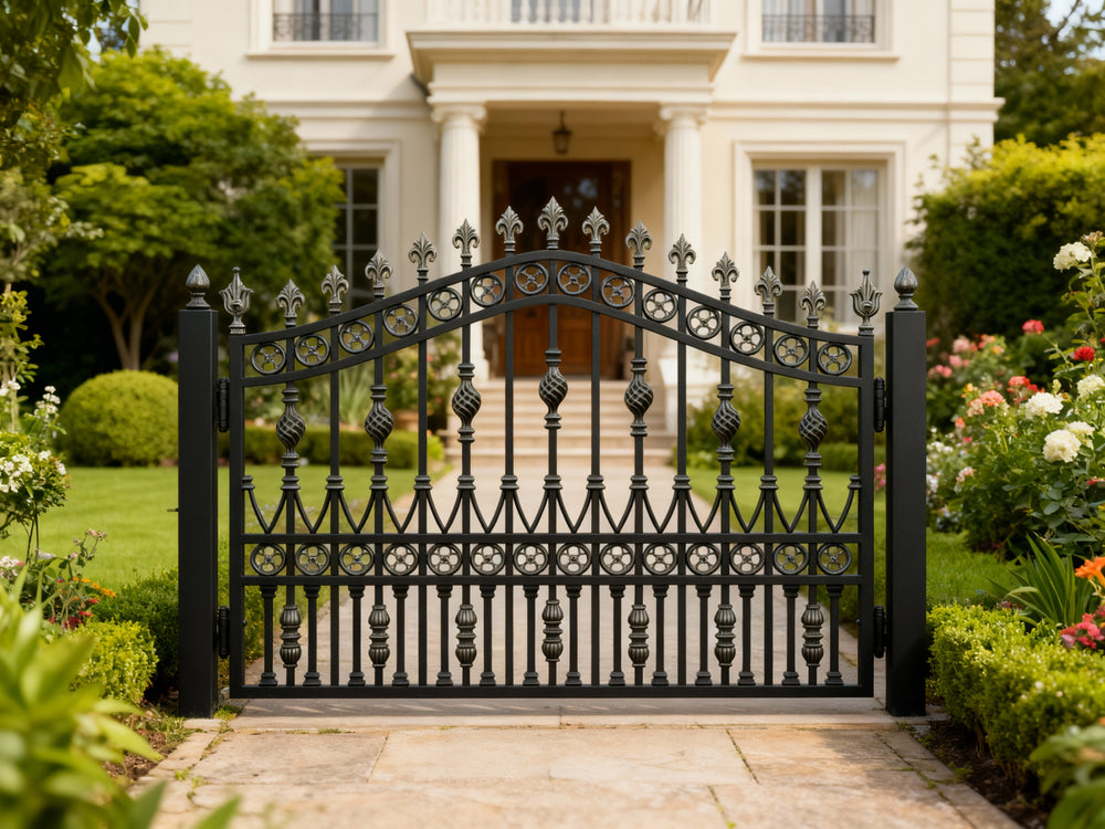 A door that speaks in scrolls and symmetry. Floracrest Passage features vertical bars topped with spear-like finials, several of which are twisted for added texture. The arched top is adorned with circular floral medallions, while the lower section includes mirrored scrollwork for visual balance. Ideal for estate entries, garden transitions, or decorative side gates that blend classical elegance with secure craftsmanship.