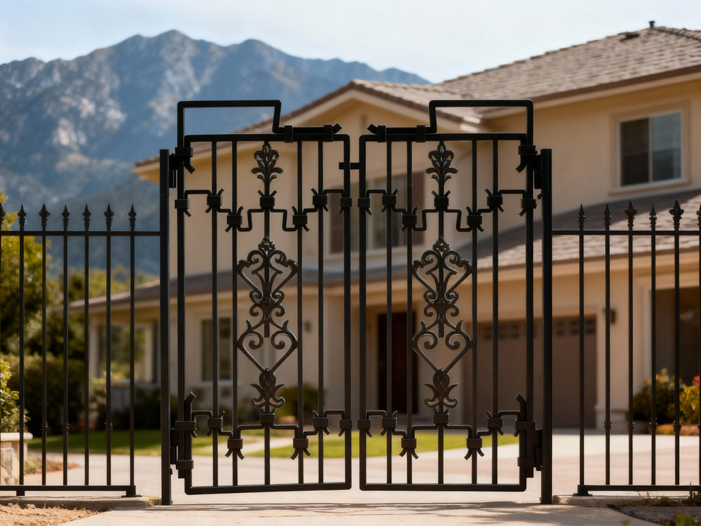 A door that blooms with balance. Floracrest Passage features two symmetrical panels joined at the center, each adorned with elegant scrollwork, floral motifs, and vertical bar lattice. Designed for garden entries, residential walkways, or courtyard transitions, this man door blends classical ornamentation with secure craftsmanship—ideal for enhancing curb appeal with timeless beauty.