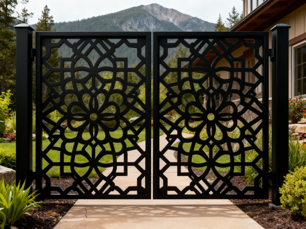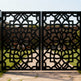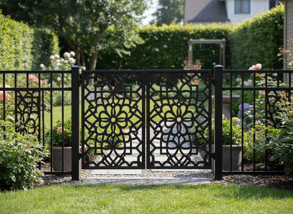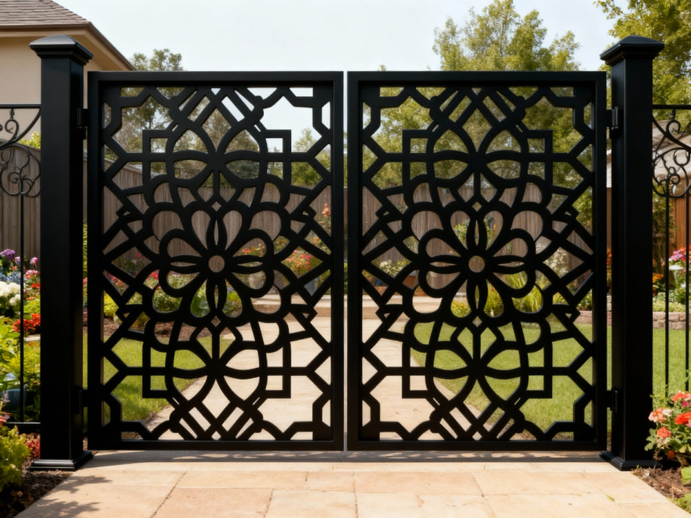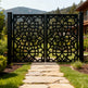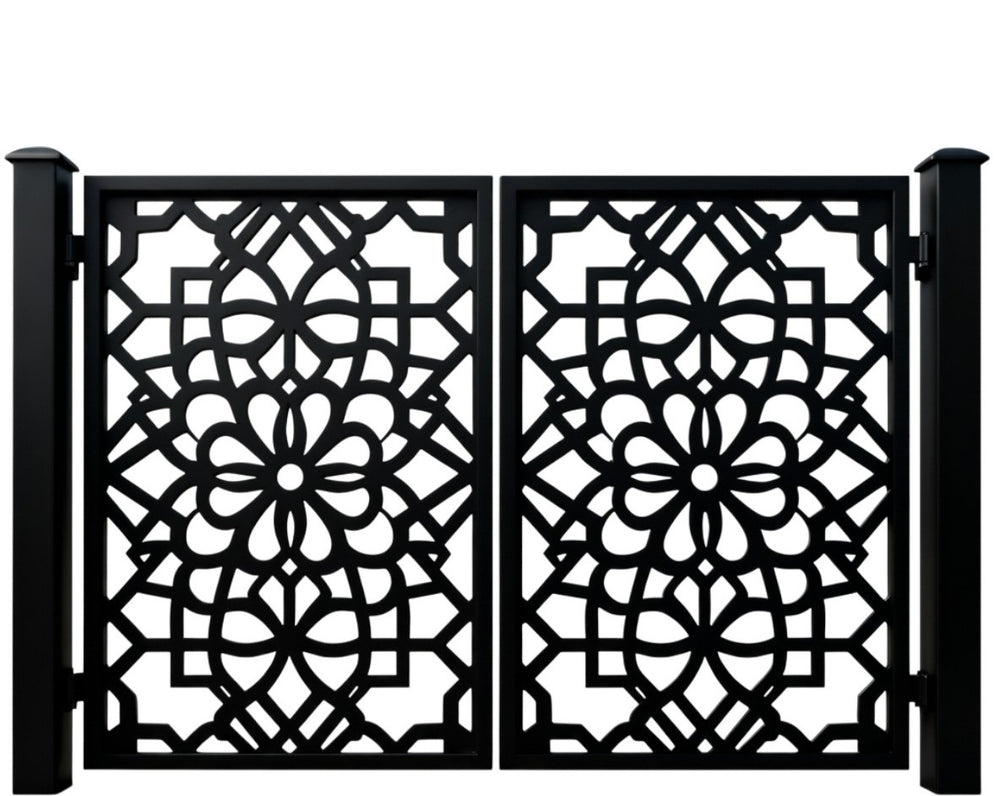 A door that blossoms in symmetry. Flora frame Passage features two panels adorned with stylized floral medallions, surrounded by interlocking geometric shapes and curved accents. The design is both ornamental and structured, offering a bold architectural statement—ideal for estate entries, garden transitions, or decorative partitions that blend floral elegance with modern precision.
