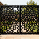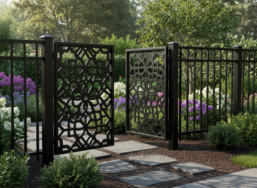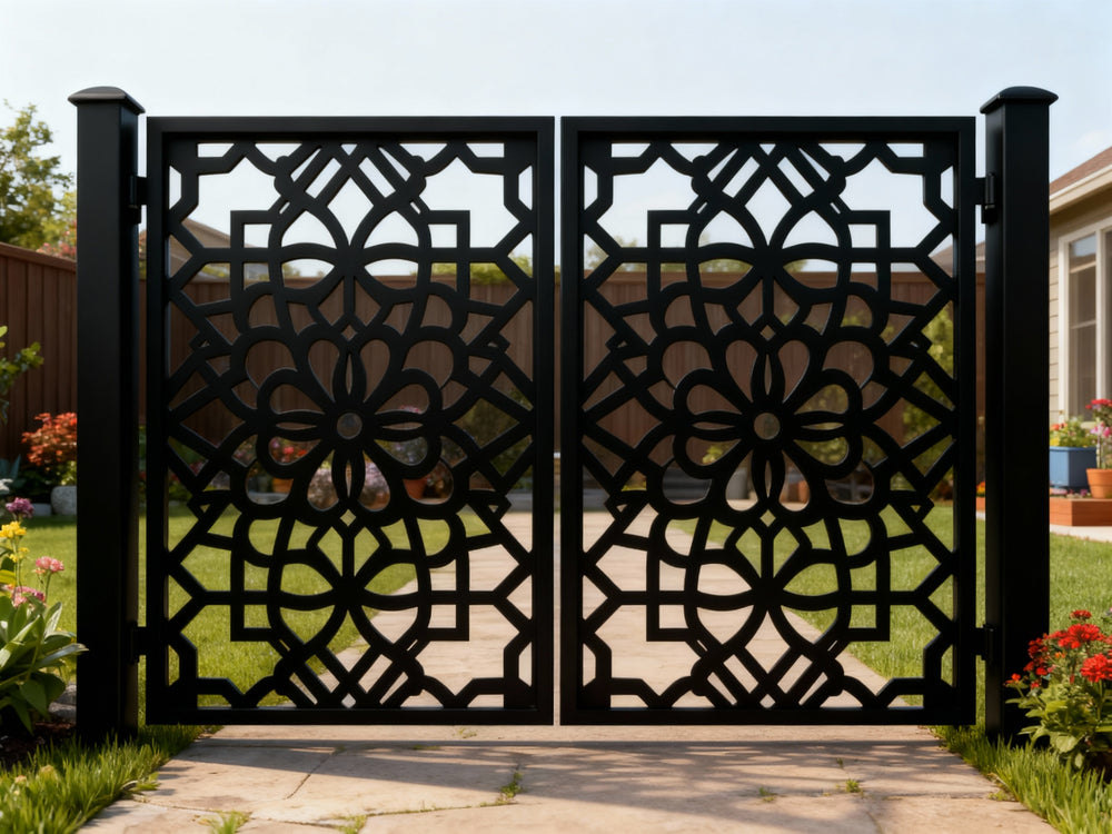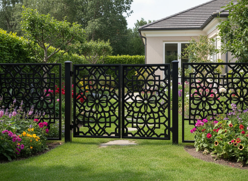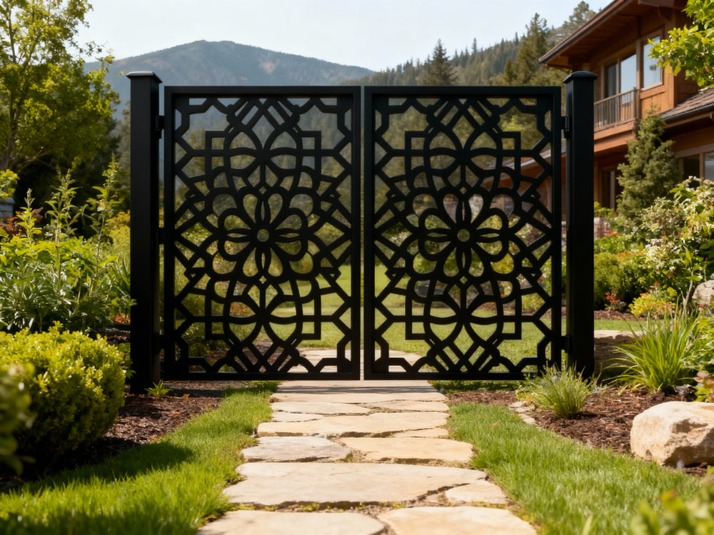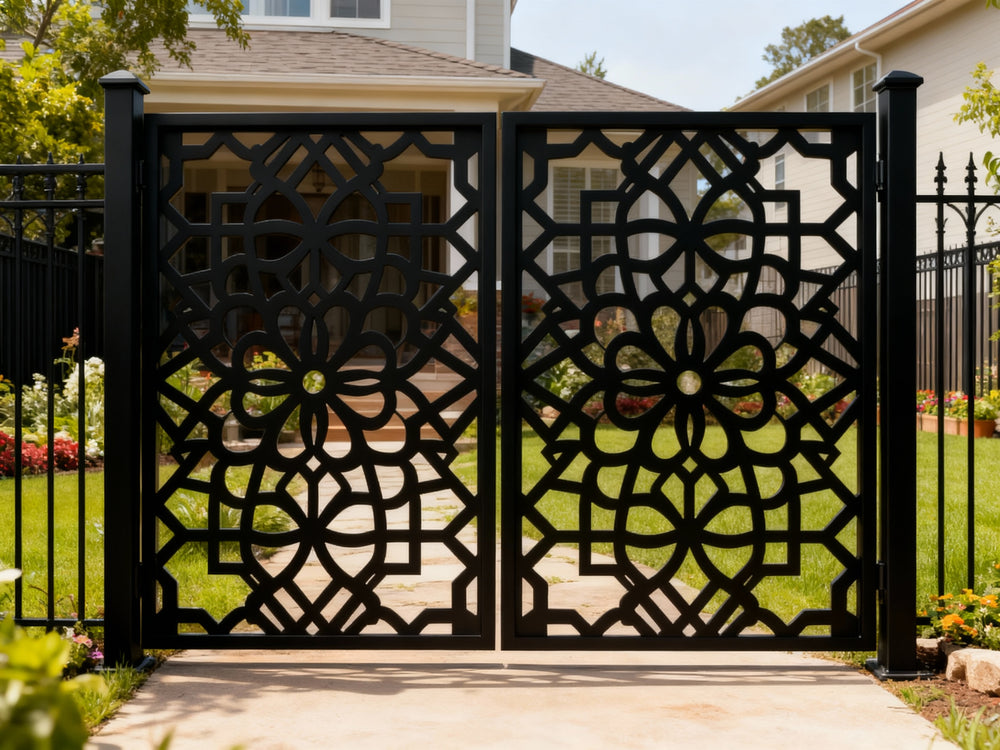 A door that blossoms in symmetry. Flora frame Passage features two panels adorned with stylized floral medallions, surrounded by interlocking geometric shapes and curved accents. The design is both ornamental and structured, offering a bold architectural statement—ideal for estate entries, garden transitions, or decorative partitions that blend floral elegance with modern precision.
