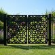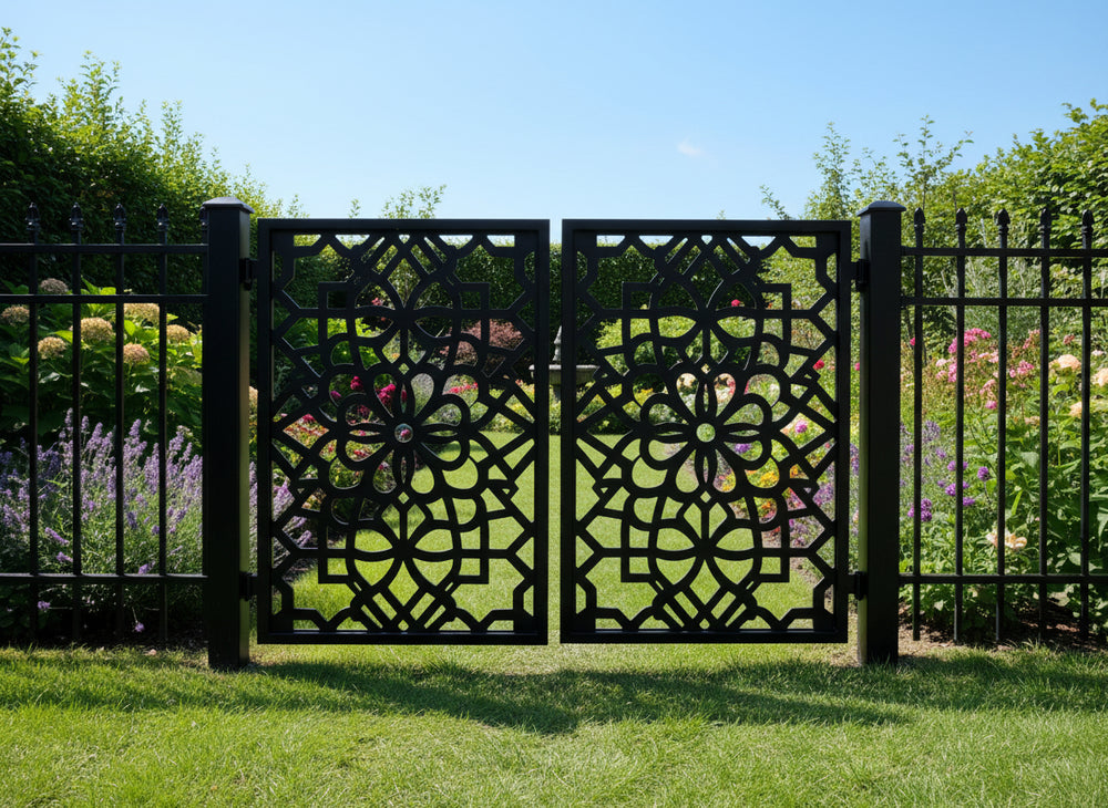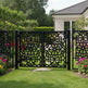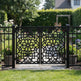geometric floral man door, symmetrical metal gate, ornamental double-panel garden entry, Canadian custom gate, Taimco decorative passage door, manual operation estate gate
