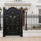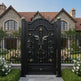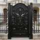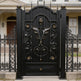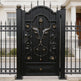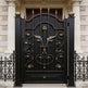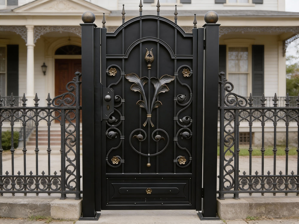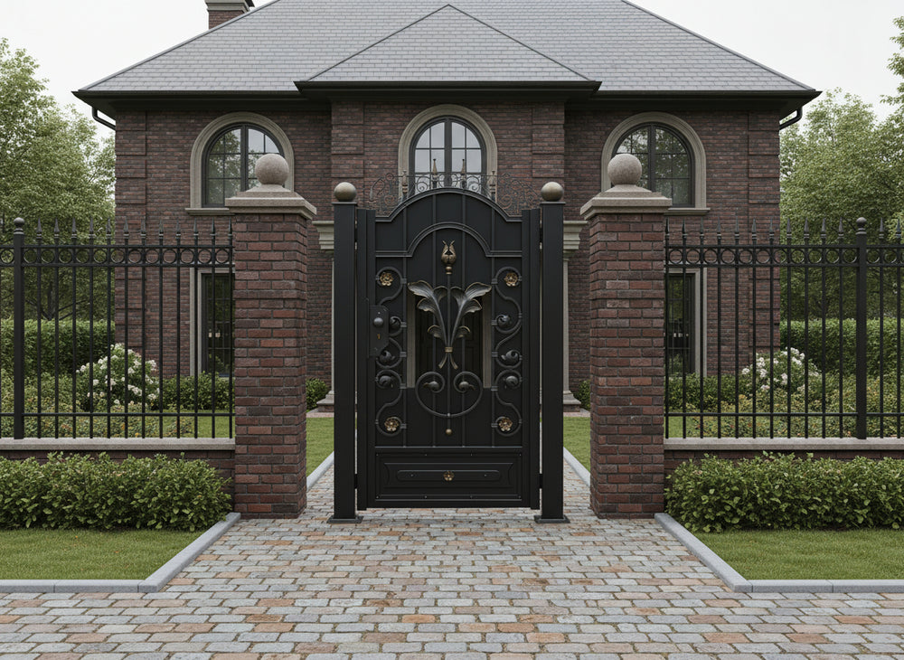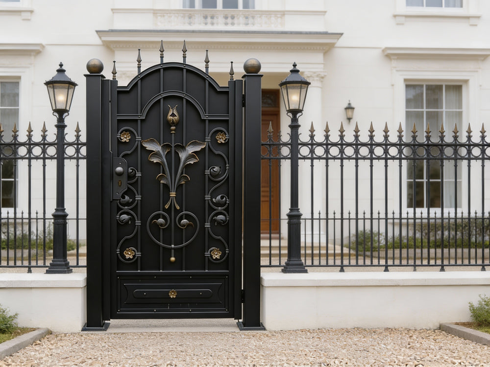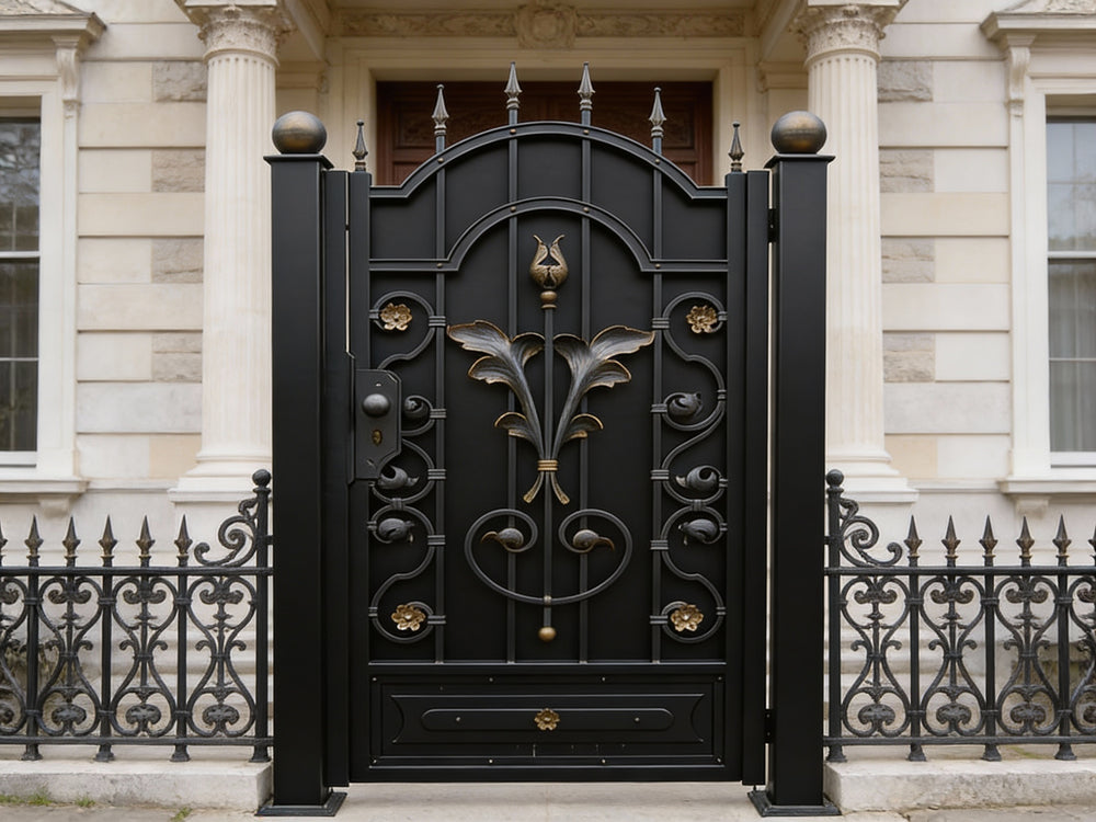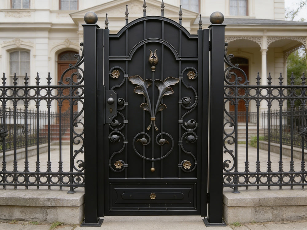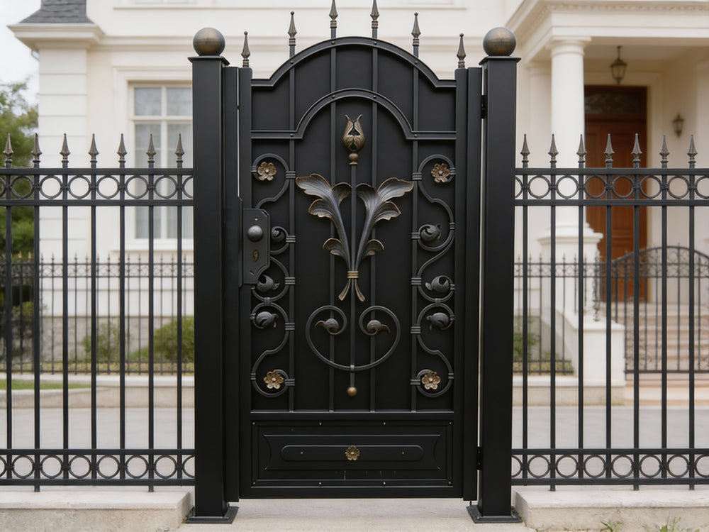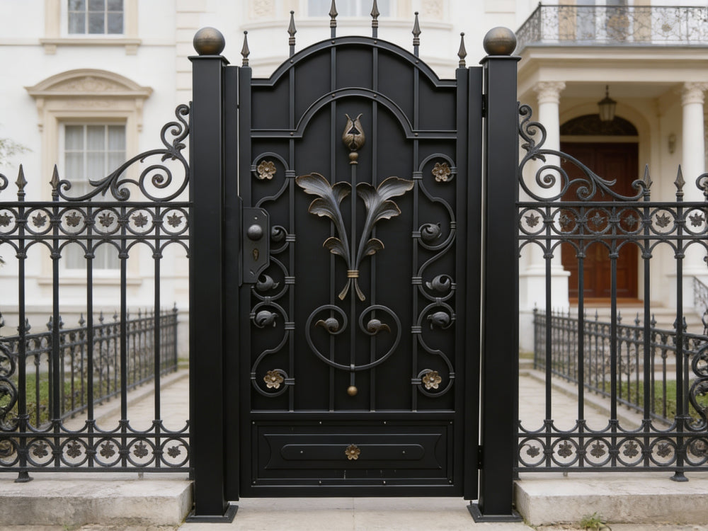 A door that blooms with regal elegance. Floraglory Passage features two symmetrical panels framed in matte black, each showcasing a central stylized flower with sweeping leaves, surrounded by ornamental scrollwork and crowned with gold-accented finials. The interplay of black iron and gilded detail evokes classical refinement and garden grandeur. Ideal for estate entries, boutique walkways, or ornamental garden transitions, this man door blends expressive craftsmanship with secure functionality.
