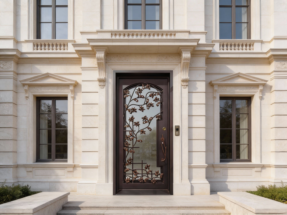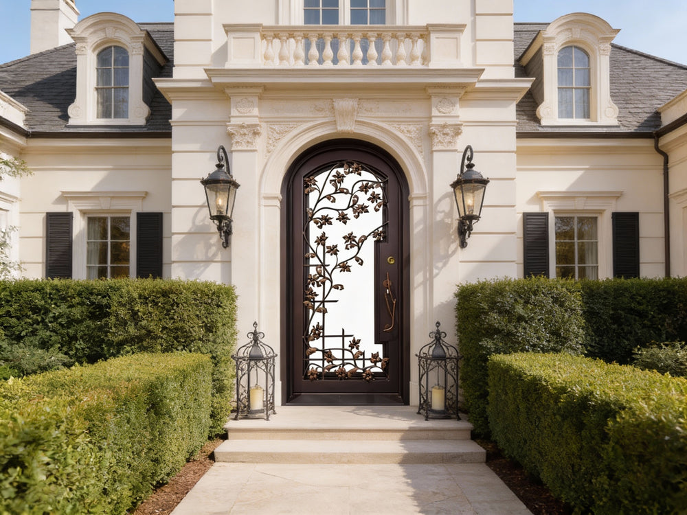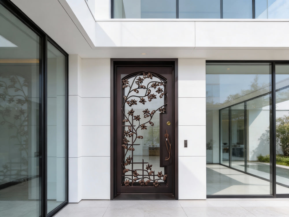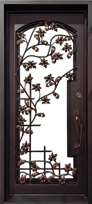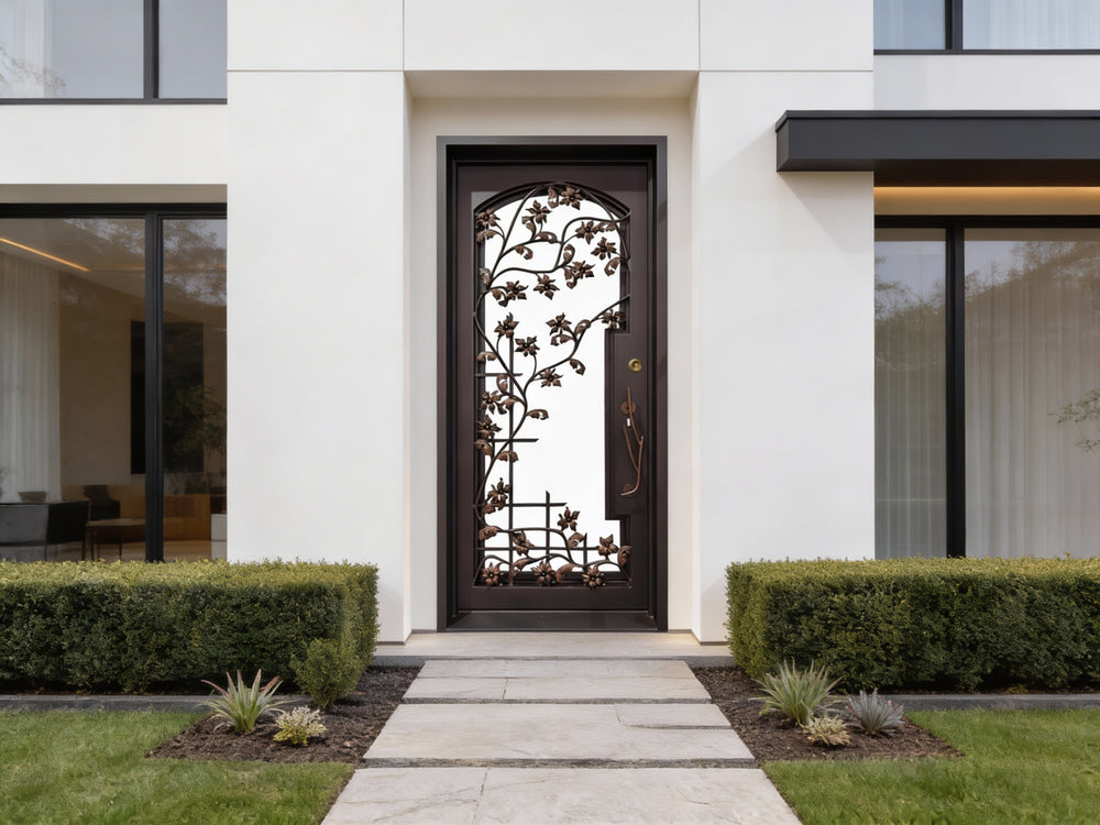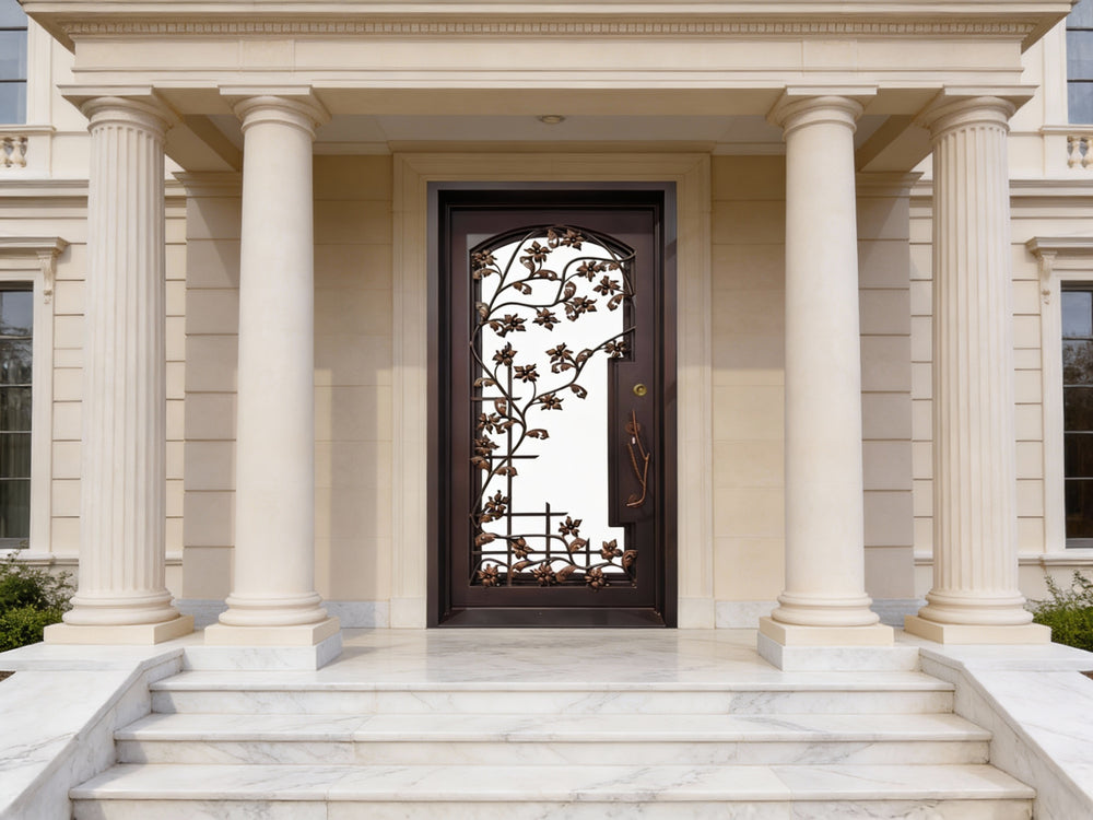 This single-panel entry door features an elaborate leaf and vine motif, crafted entirely through traditional sand casting techniques rather than laser cutting. The dimensional depth and artisanal richness of the decorative elements evoke timeless craftsmanship, with cast iron components carefully fused to the solid iron core.