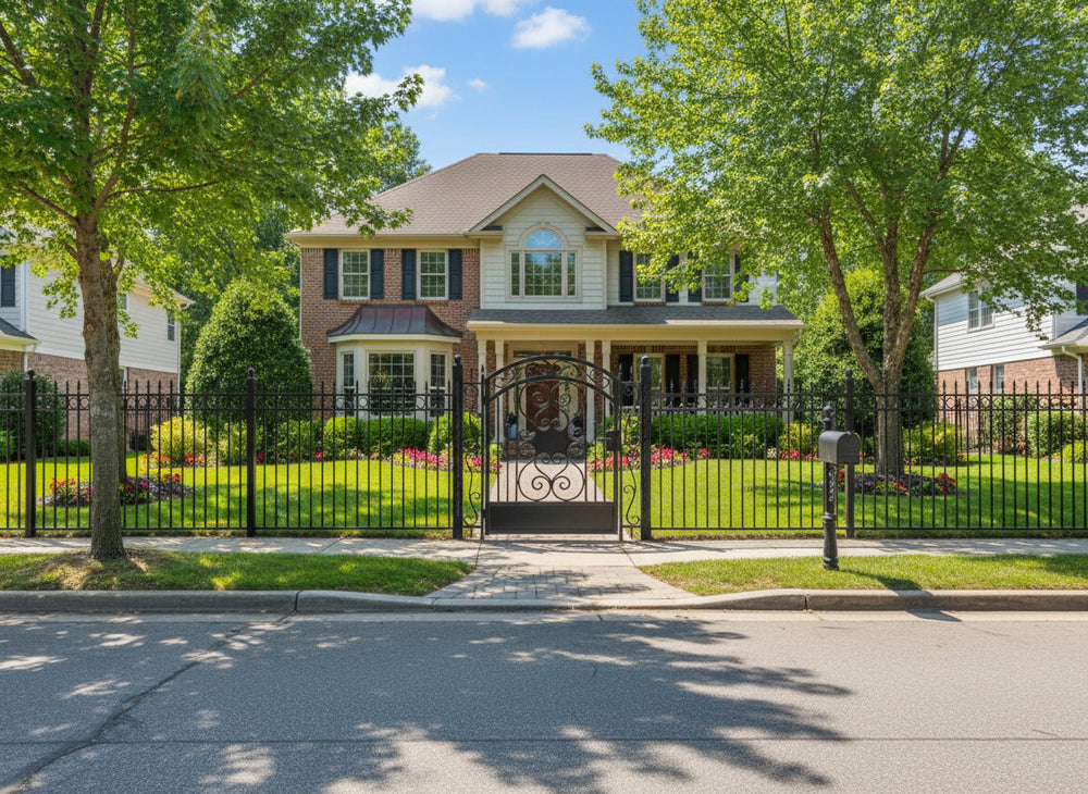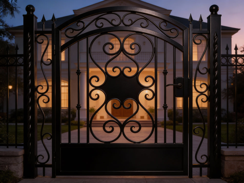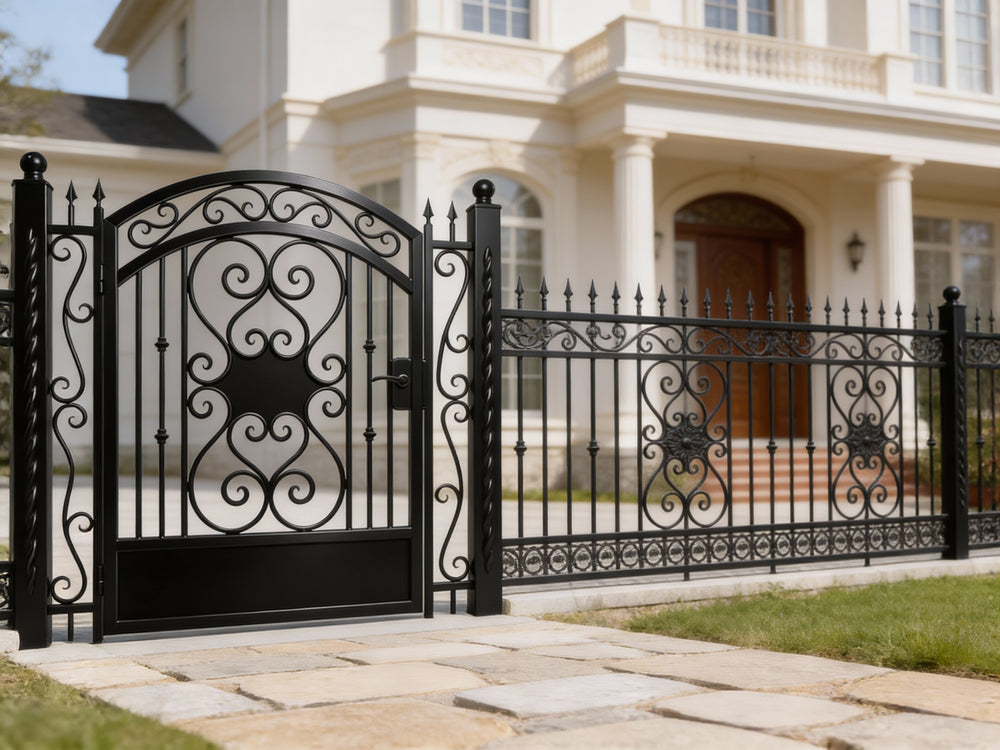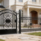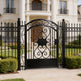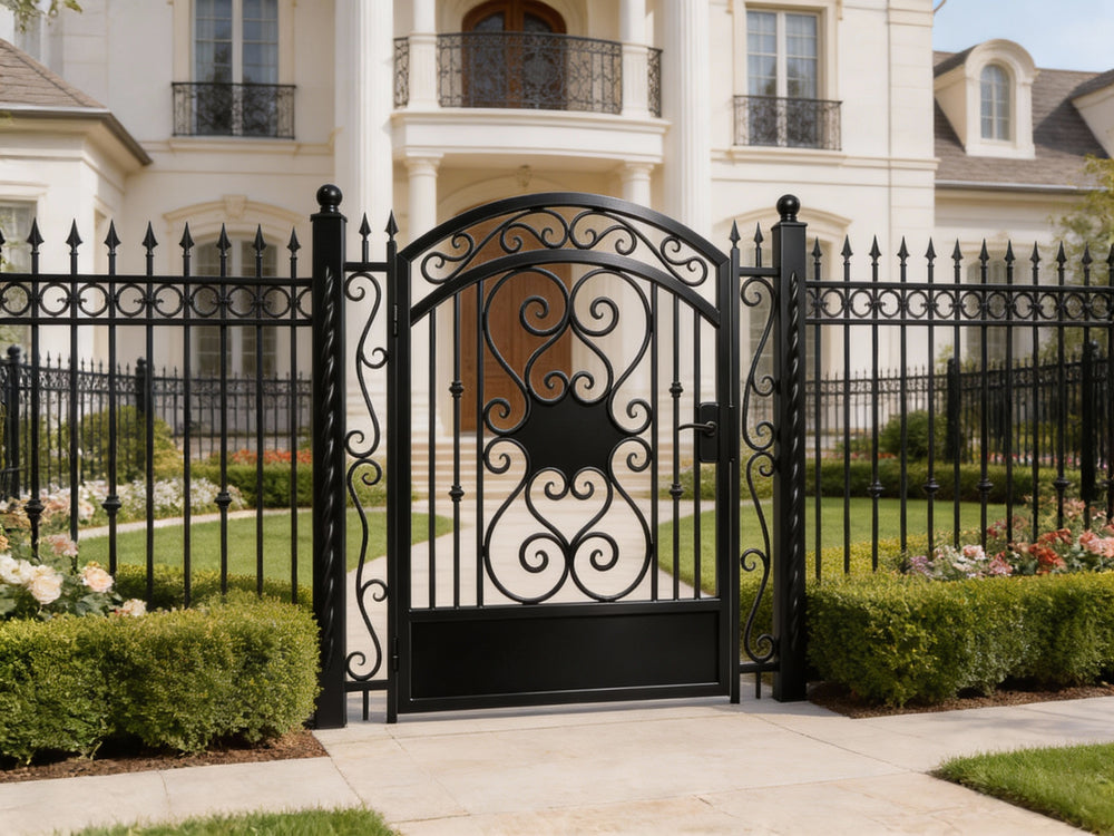 A door that flows with elegance and symmetry. Floralveil Passage features a single swing panel framed by vertical bars and crowned with an arched scroll flourish. The centerpiece showcases mirrored swirling patterns and floral accents, while the bottom panel anchors the design with three evenly spaced floral medallions. Ideal for garden entries, residential walkways, or courtyard transitions, this man door blends ornamental charm with secure craftsmanship.