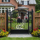 floral scroll man door, ornamental wrought iron gate, arched garden entry, Canadian custom gate, Taimco Floralveil model, manual operation passage door