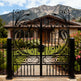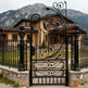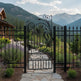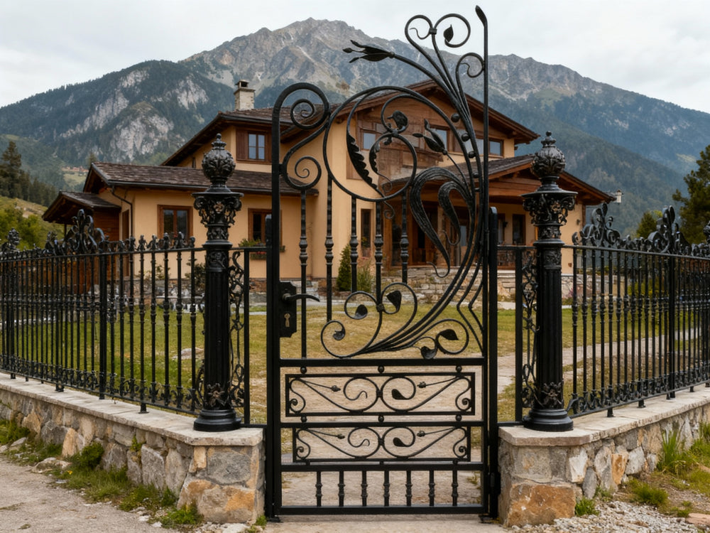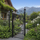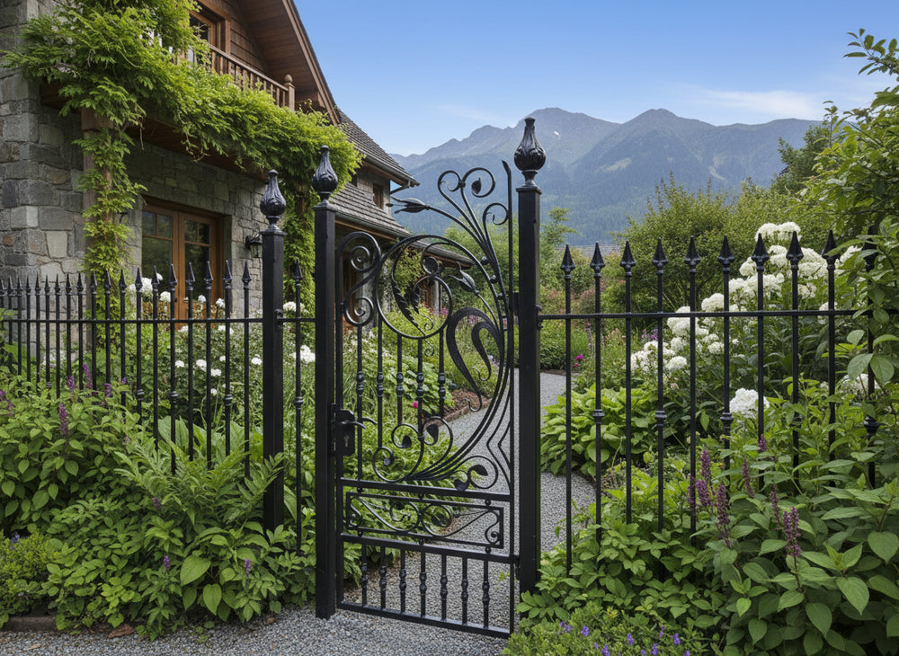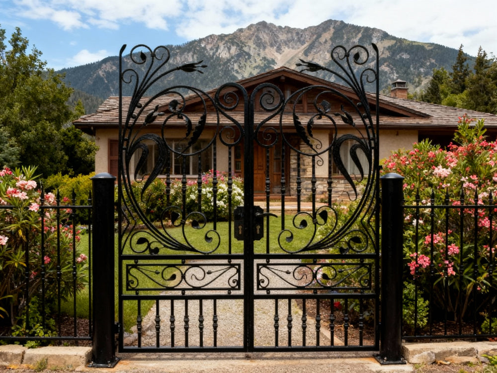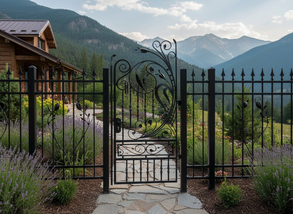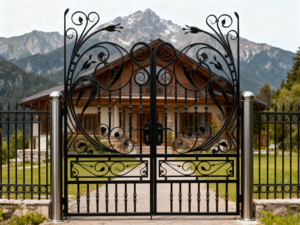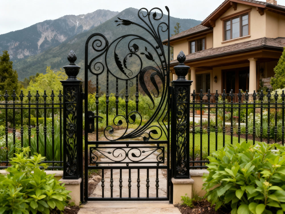A door that blooms with boldness. Floravibe Passage features a large circular crest of swirling scrolls and stylized floral motifs at the top, balanced by vertical bars and mirrored scrollwork below. The symmetrical layout and intricate craftsmanship make this gate ideal for estate entries, garden transitions, or decorative boundaries that celebrate elegance, artistry, and secure design.