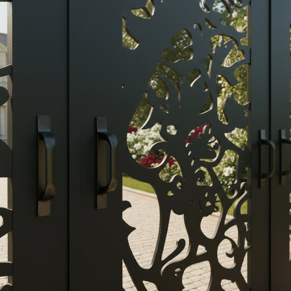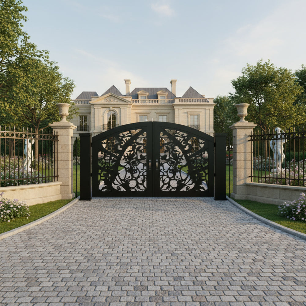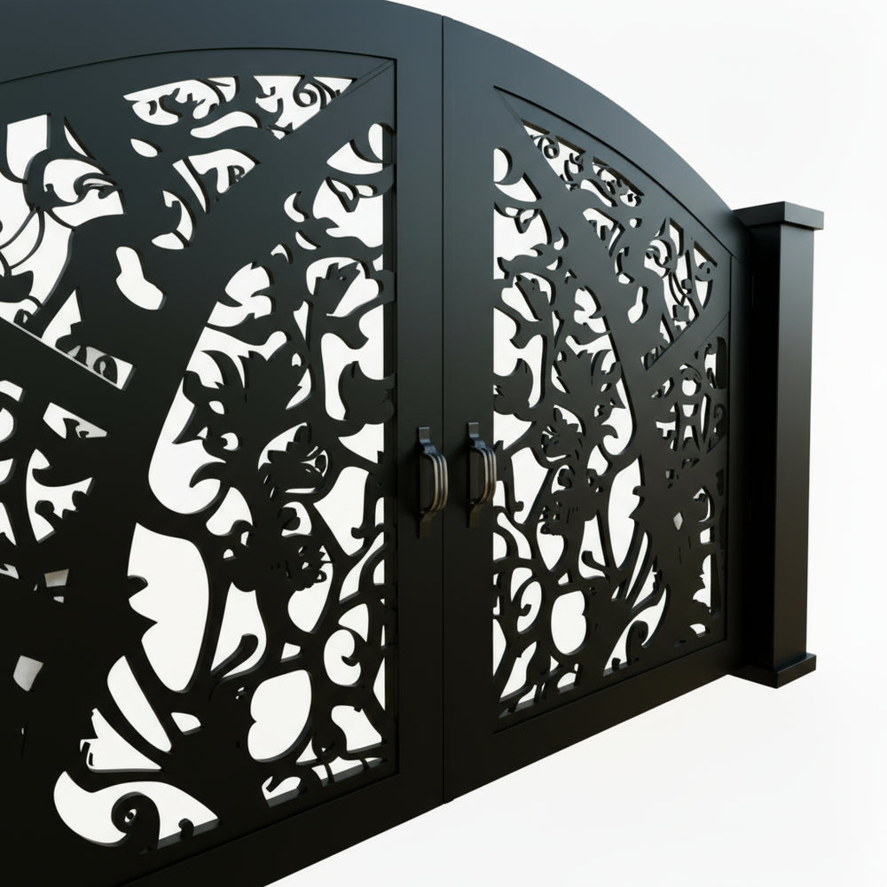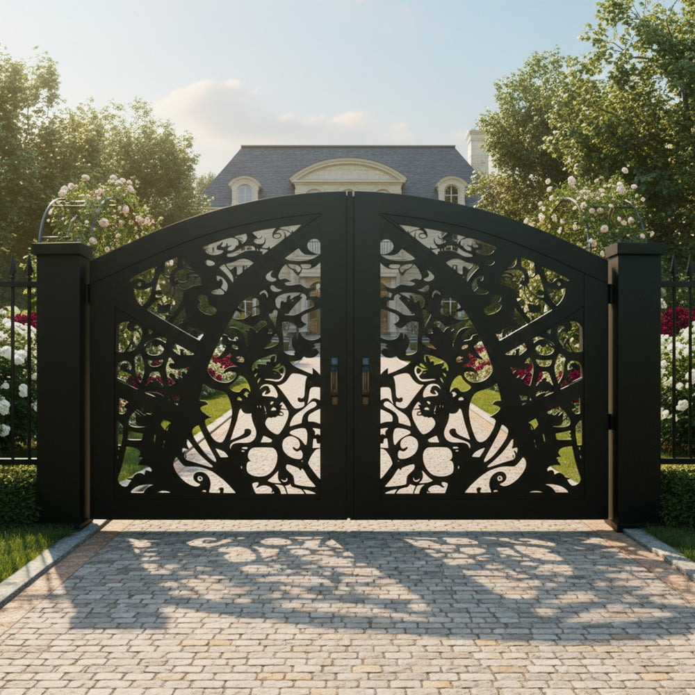 A gate that sings in curves. Floravine Aria features dual swing panels crowned by a gentle arch, adorned with flowing vine motifs, stylized floral accents, and symmetrical scrollwork. The interplay of curves and angles creates a dynamic silhouette, while the vertical bars and sturdy posts ensure structural integrity. This design evokes serenity, craftsmanship, and timeless charm—perfect for garden estates or refined residential entrances.