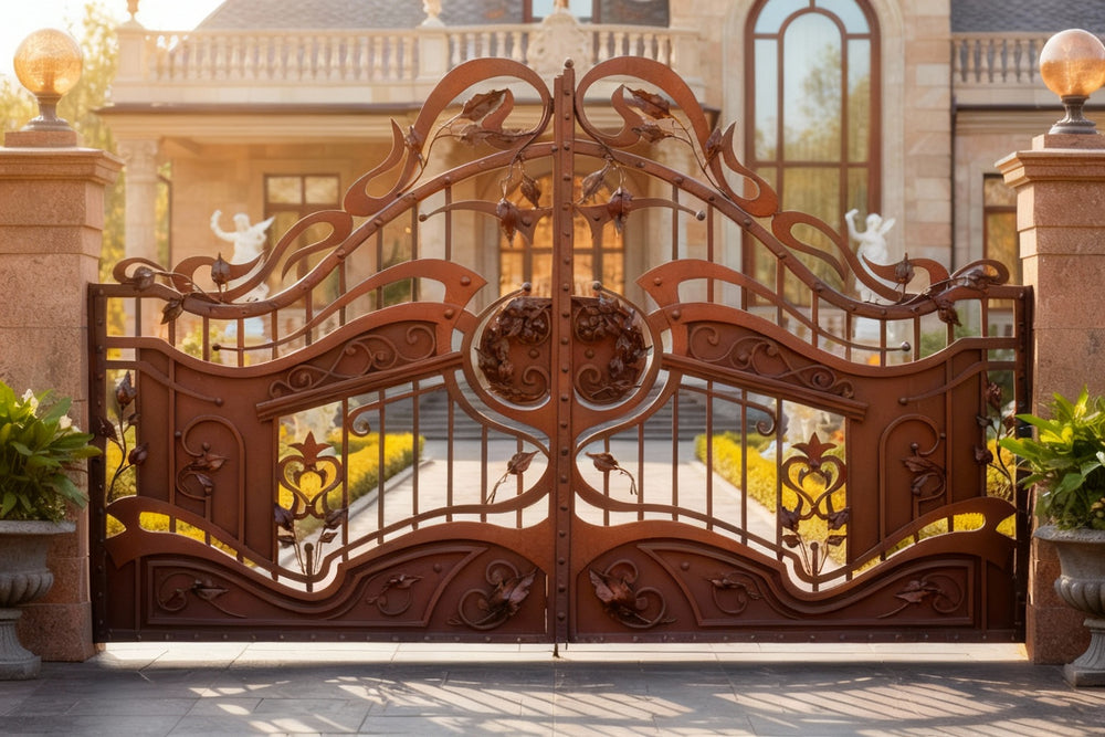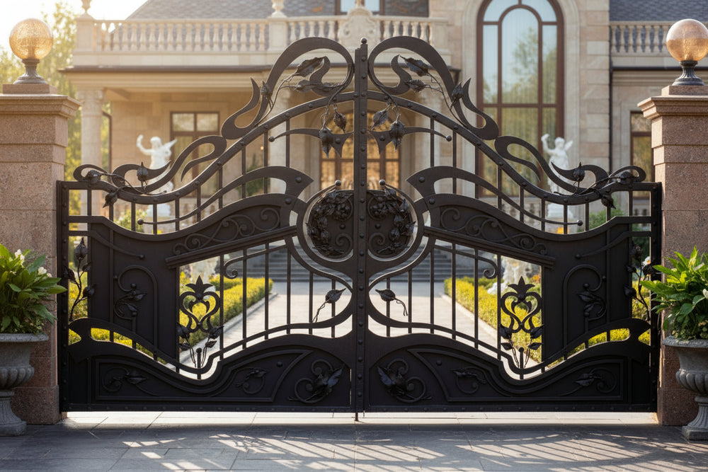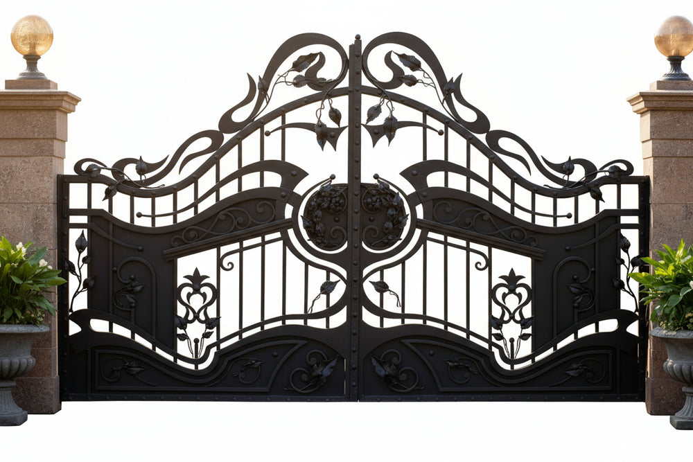 Make a grand entrance with Florentine Bloom, a wrought iron driveway gate featuring cascading scrollwork, bell-shaped floral motifs, and symmetrical botanical flourishes. Designed for luxury estates, garden villas, and architectural showpieces, this gate blends romantic artistry with structural integrity—turning your property’s threshold into a work of art.