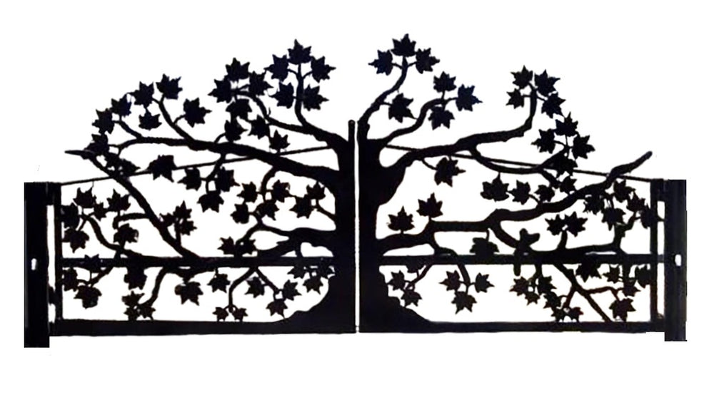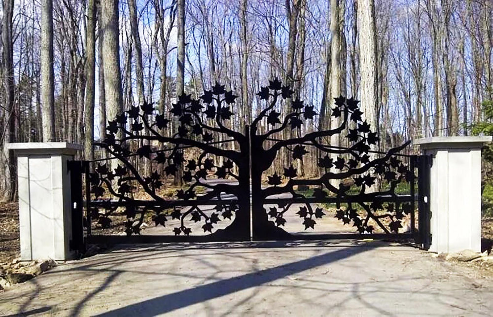 Plasma-cut tree gate, woodland driveway gate, custom steel entrance gate, nature-inspired metal gate, Canadian artistic gate, forest estate gate, heavy-duty decorative gate, Taimco driveway gate, outdoor sculptural gate, stylized tree gate design