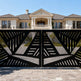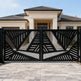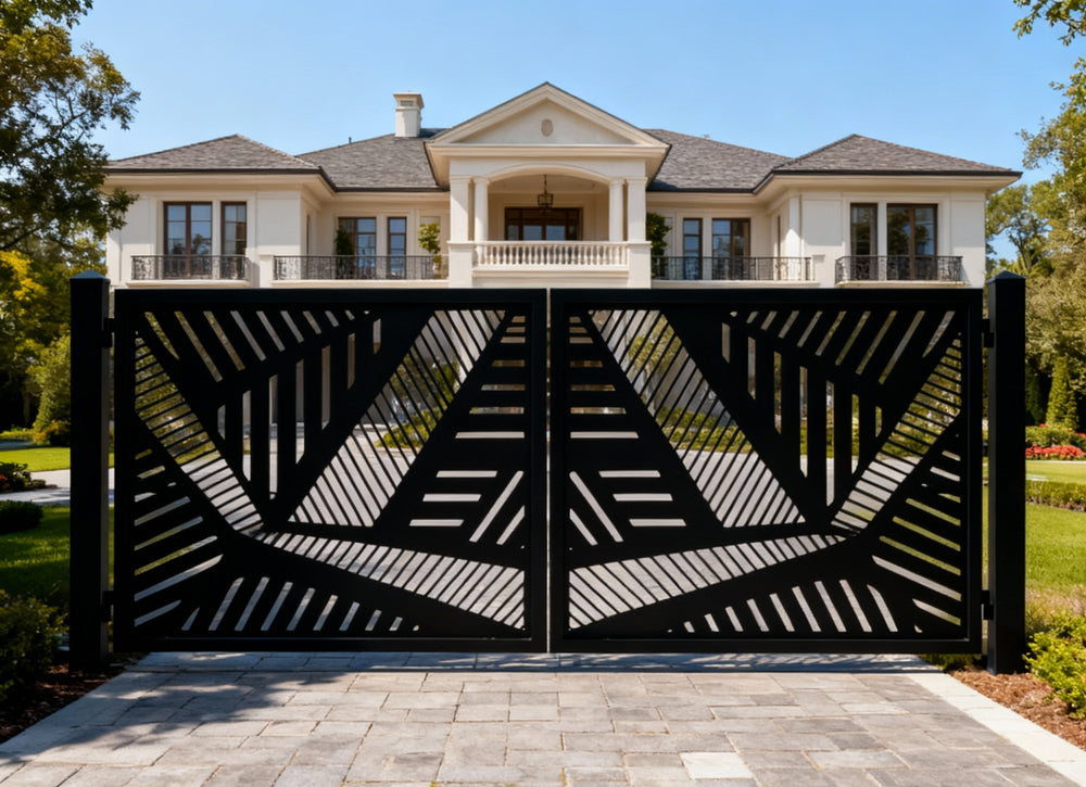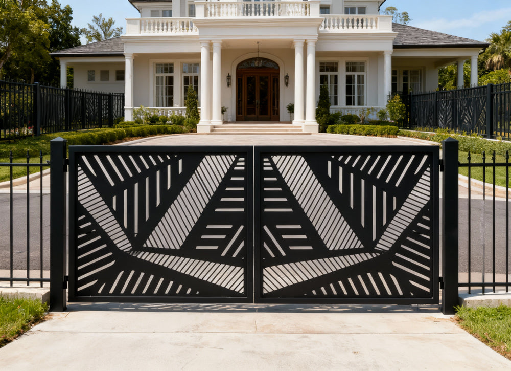 Geometric driveway gate, plasma-cut steel gate, modern abstract gate design, custom metal entrance gate, architectural steel gate, Canadian designer gate, heavy-duty decorative gate, Taimco driveway gate, urban estate gate, minimalist outdoor gate