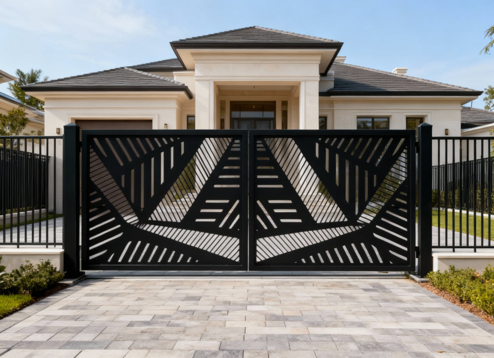 Make a striking entrance with Fracture Lines, a plasma-cut steel driveway gate featuring a dynamic pattern of intersecting lines and angular shapes. Inspired by modern architecture and abstract design, this gate offers a sleek, minimalist aesthetic that plays with light and shadow—perfect for contemporary homes, urban estates, or design-forward properties.