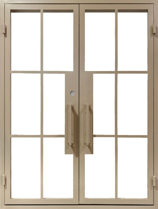 - Design: French-style double doors with square top, scroll bars, and solid kickplate panels