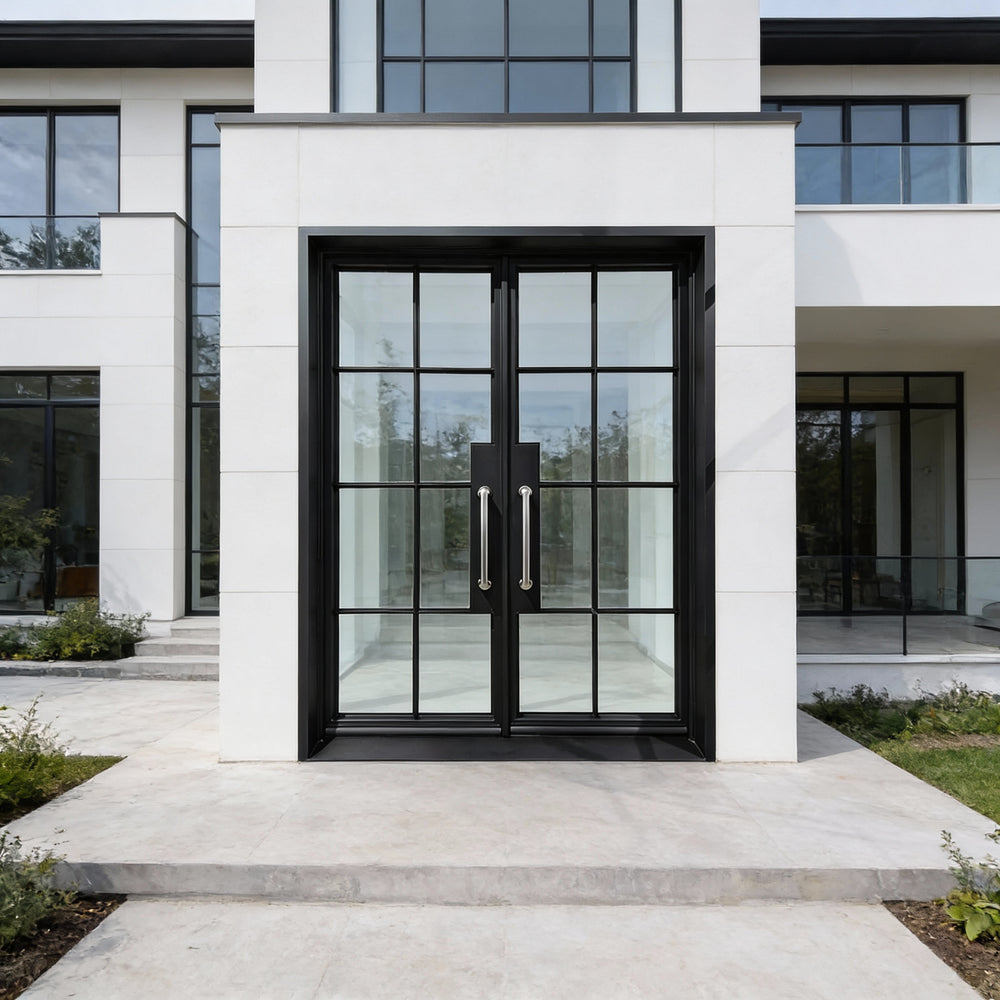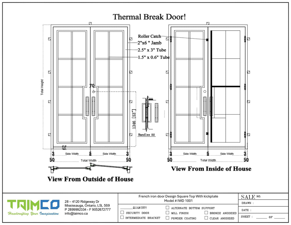 Bring timeless elegance to your entryway with Model IWD1001, a handcrafted French-style double wrought iron door featuring a square top profile, ornate scrollwork, and bold kickplate panels. Designed in Canada using hot-dipped galvanized steel and sealed in matte black powder coating, this door system offers durability, visual symmetry, and energy efficiency. Perfect for traditional homes and modern builds seeking classic European flair, it includes dual-pane glass inserts, heavy-duty hinges, and complete weatherproofing in a ready-to-install package.