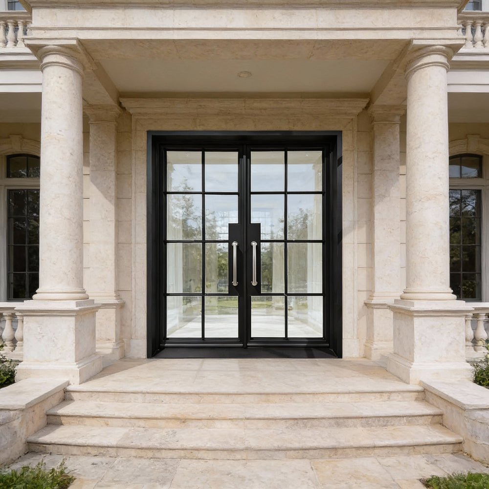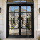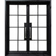 - Design: French-style double doors with square top, scroll bars, and solid kickplate panels