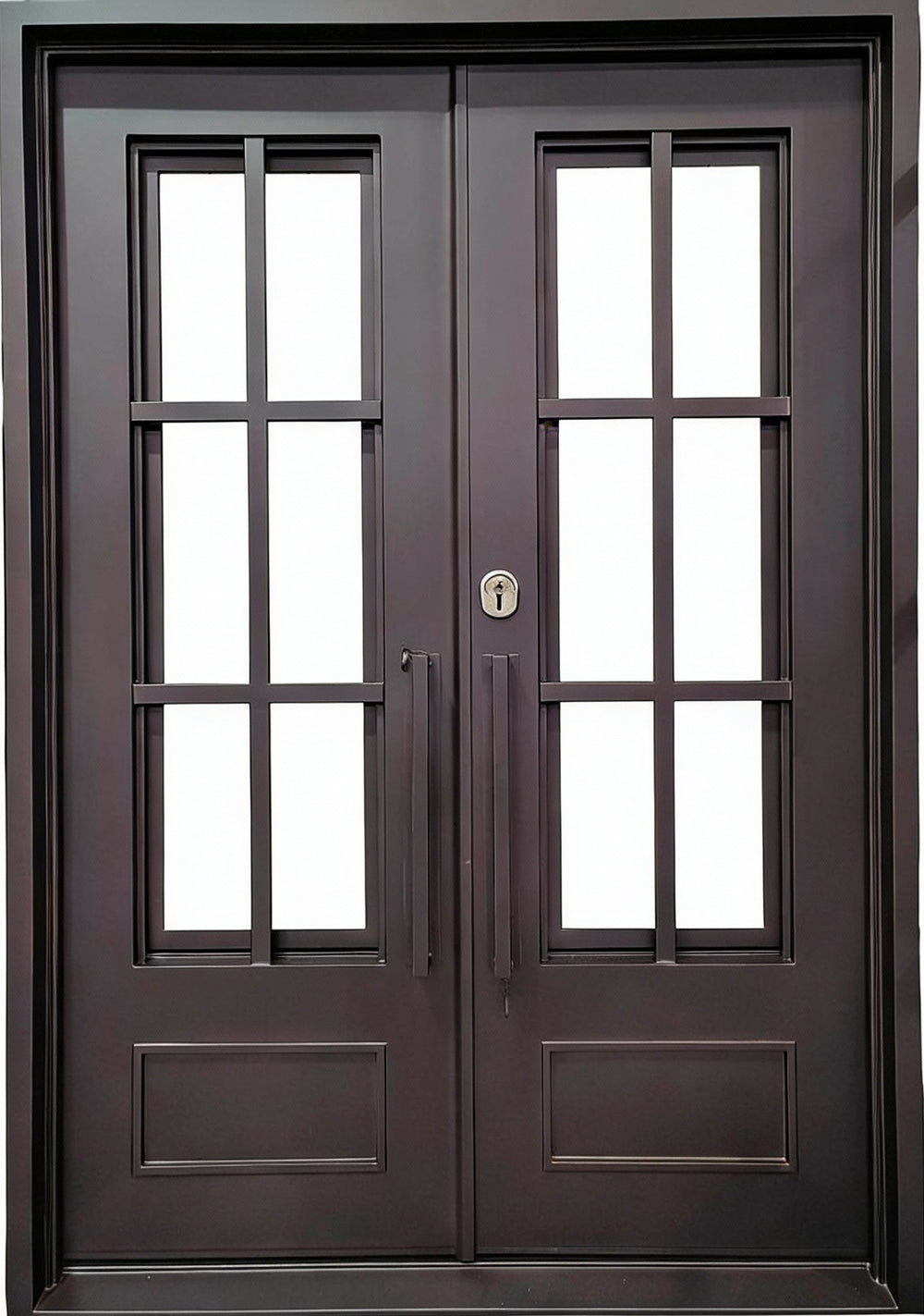 Refine your home's entrance with Model IWD1046, a square-top French wrought iron door showcasing elegant scrollwork and a strong kickplate panel in matte black finish. Built in Canada from galvanized steel, this durable entry system suits buyers seeking classic black iron doors, single steel French entry doors with decorative glass, and customizable wrought iron architectural solutions with energy efficiency and timeless appeal.