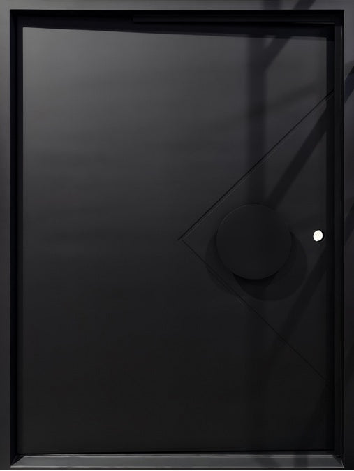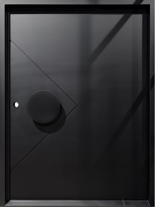 Art meets architecture in this solid iron door, where angular and circular motifs combine for a visually compelling entrance. The triangular overlay intersects the bold round handle in matte black, creating a sculptural statement perfect for high-design residential or commercial properties.