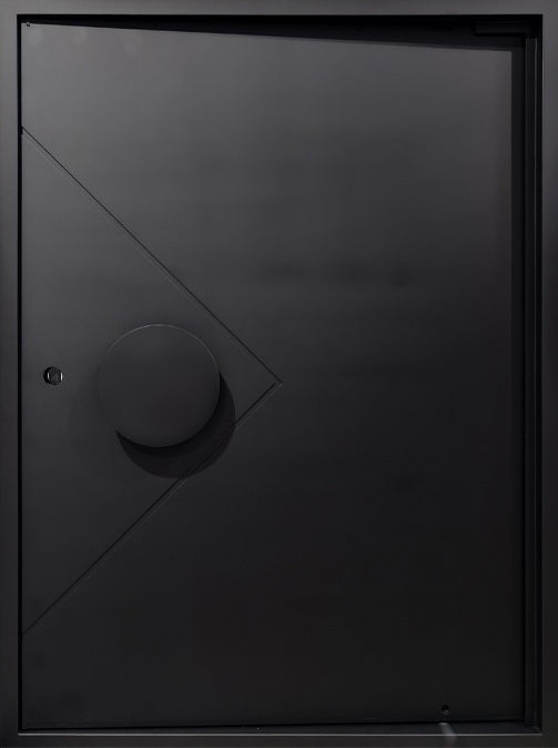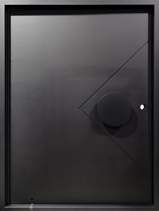 triangular steel door, modern iron door, circular handle entry door, matte black metal door, architectural iron door, geometric steel front door, custom artistic entry door, designer iron door Canada, sculptural metal door, steel security door with peephole