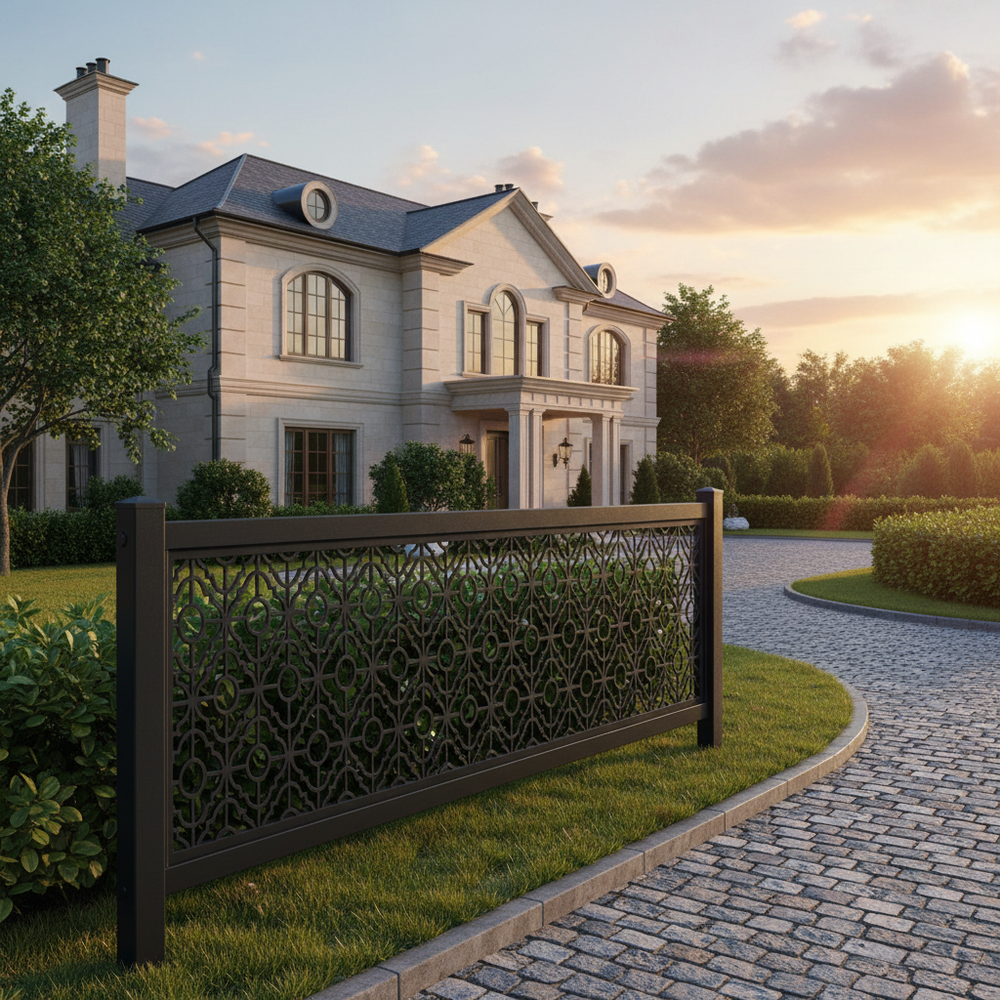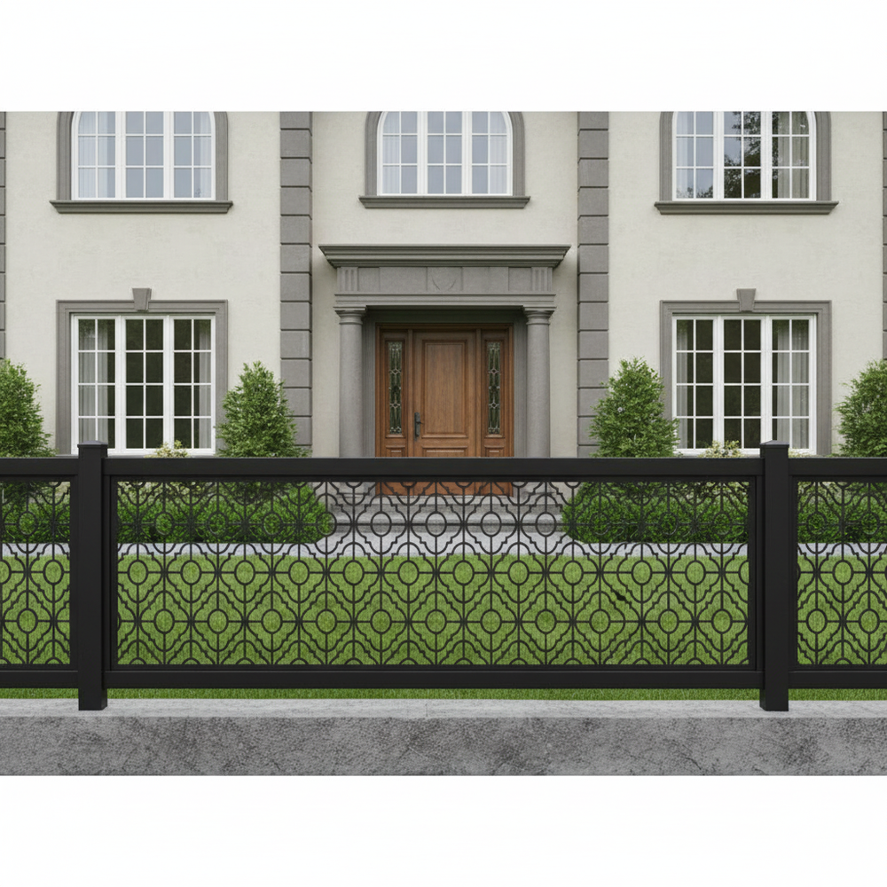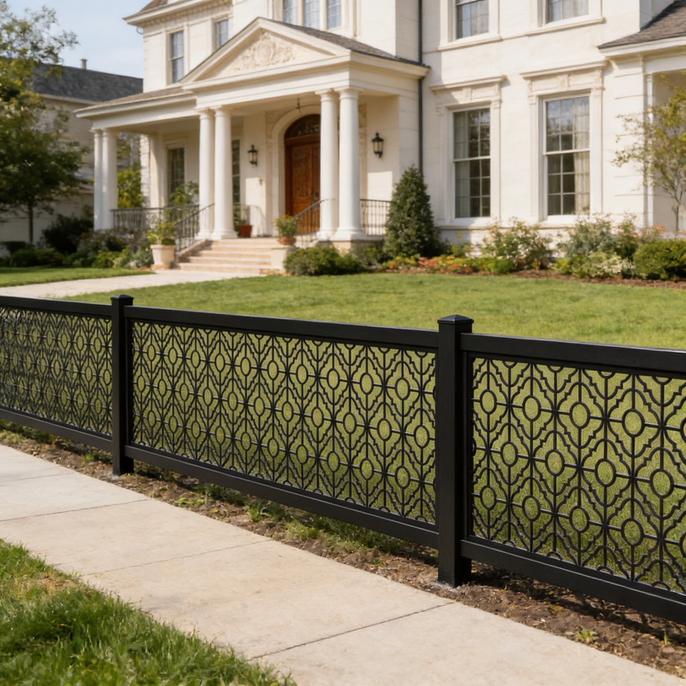 Plasma-cut fence panel, Decorative metal fence, CNC plasma cutting, Custom fence design, High-quality steel fence, Durable fence panel, Ornamental fence, Precision cutting technology, Powder-coated fence, Residential fence, Commercial fence