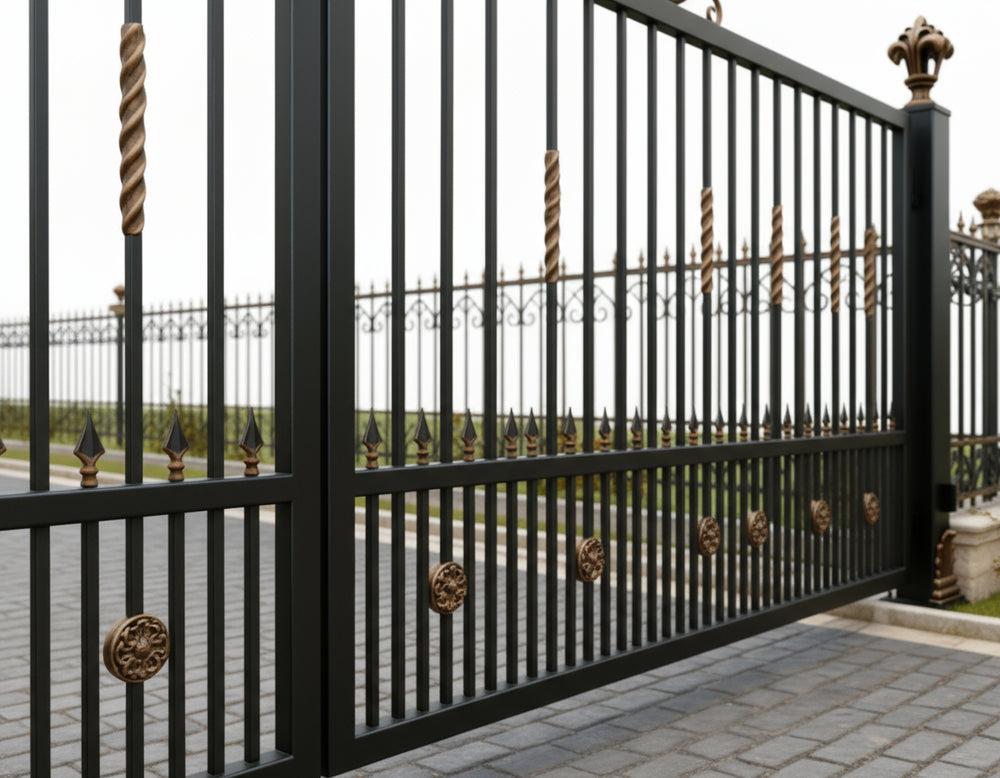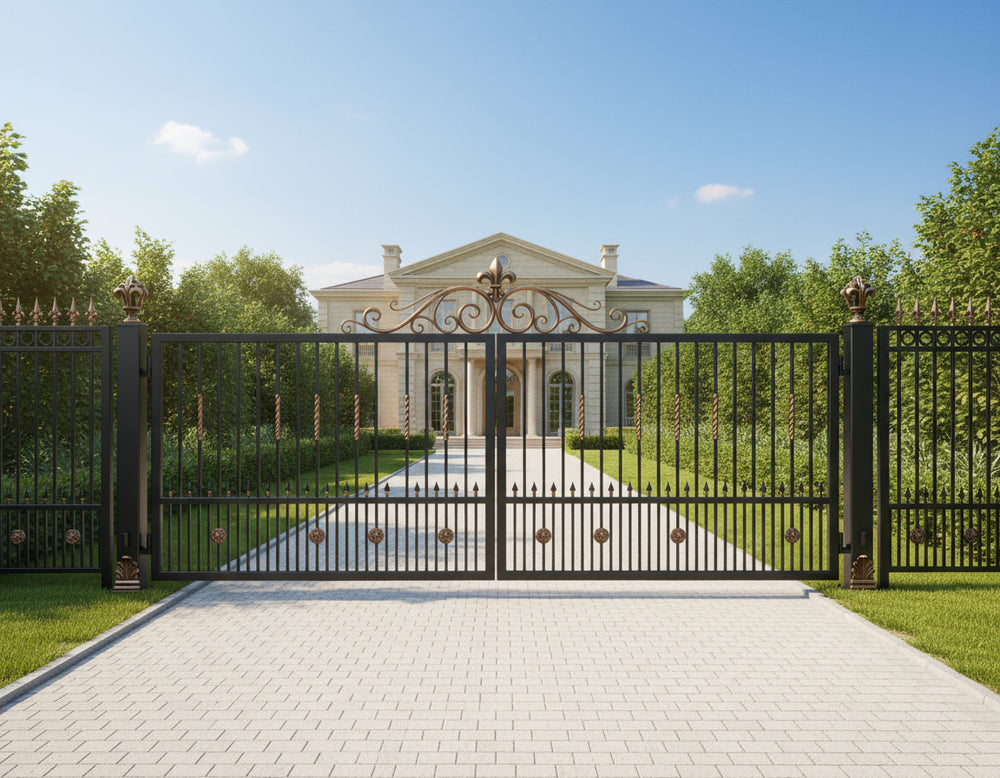 fleur-de-lis wrought iron gate, gold accent estate gate, vertical bar driveway gate, Canadian custom gate, Taimco decorative gate, luxury ornamental gate, heavy-duty artistic gate design