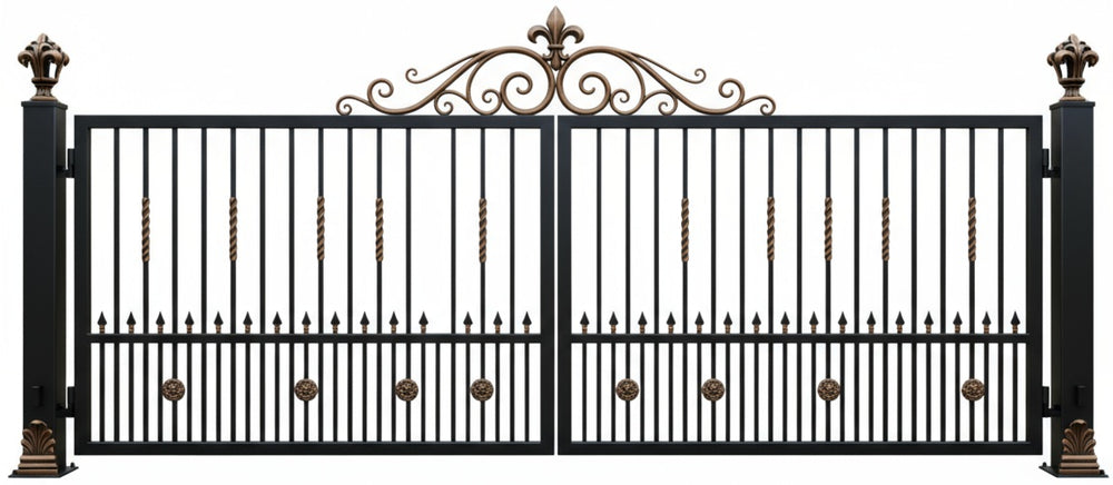 A gate that guards with grandeur. Gilded Crestline features dual swing panels with vertical bars accented by gold-twisted rods and spear finials. The lower section anchors the design with circular floral medallions, while the top is crowned by a flourish of scrollwork and a central fleur-de-lis emblem. Flanked by decorative posts with sculpted finials and base embellishments, this gate evokes nobility, craftsmanship, and timeless prestige.