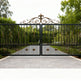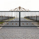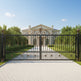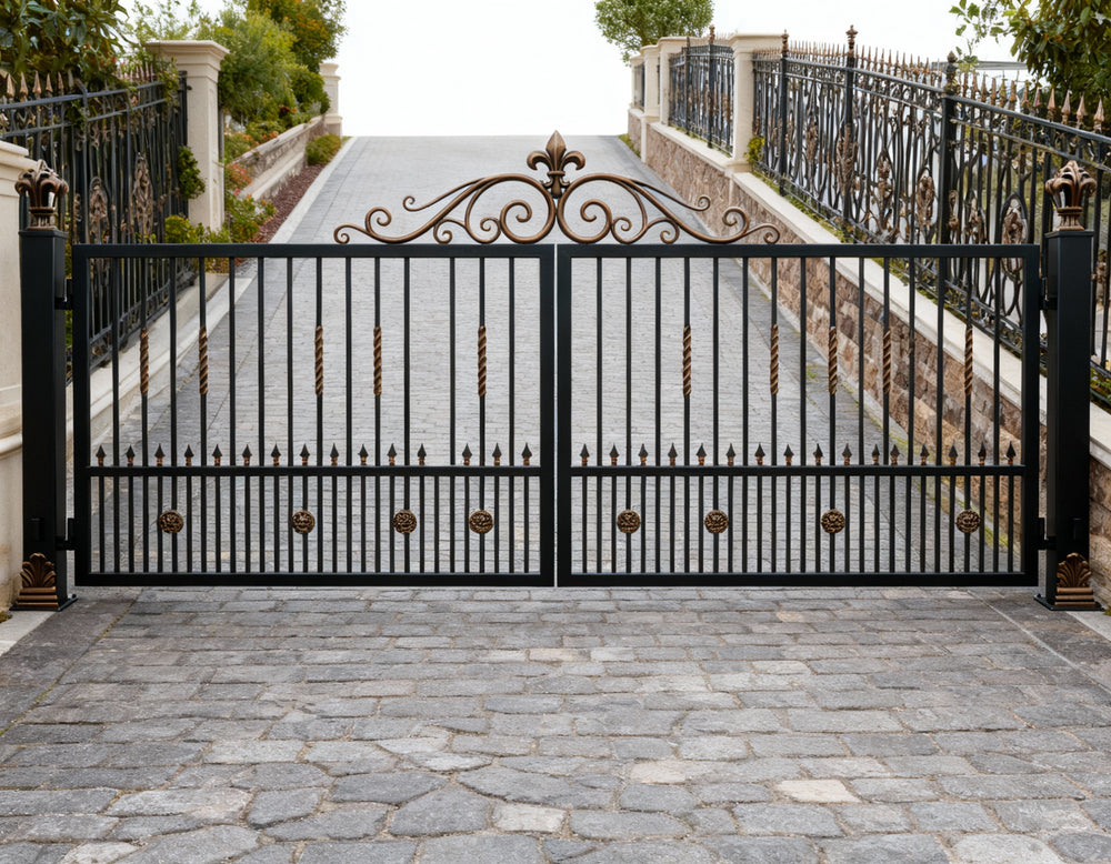 A gate that guards with grandeur. Gilded Crestline features dual swing panels with vertical bars accented by gold-twisted rods and spear finials. The lower section anchors the design with circular floral medallions, while the top is crowned by a flourish of scrollwork and a central fleur-de-lis emblem. Flanked by decorative posts with sculpted finials and base embellishments, this gate evokes nobility, craftsmanship, and timeless prestige.