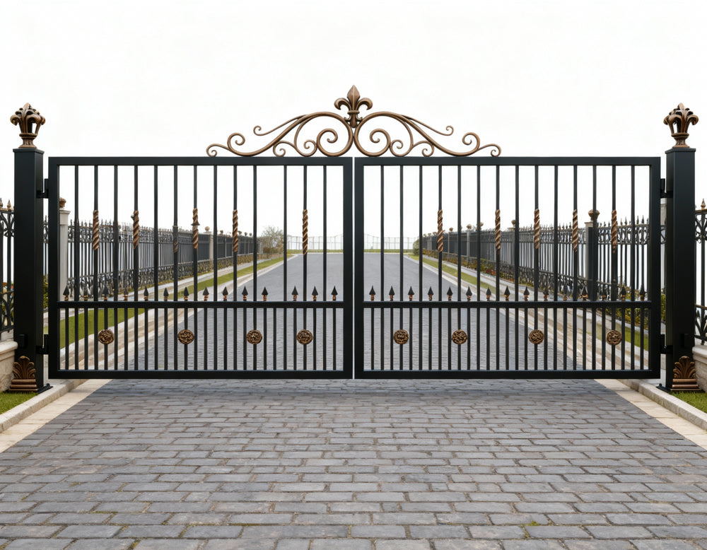 fleur-de-lis wrought iron gate, gold accent estate gate, vertical bar driveway gate, Canadian custom gate, Taimco decorative gate, luxury ornamental gate, heavy-duty artistic gate design