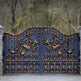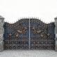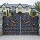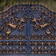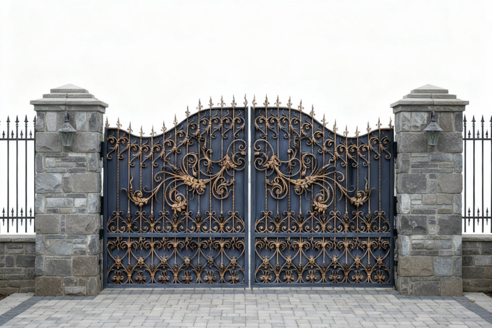 Make your entrance unforgettable. Gilded Fleur features a double-leaf wrought iron gate adorned with flowing scrollwork, floral motifs, and bronze-finished highlights. The curved top rail and pointed finials evoke classical refinement, while the lantern-lit stone pillars add warmth and stature. Perfect for estates that blend ornamental beauty with timeless architecture.