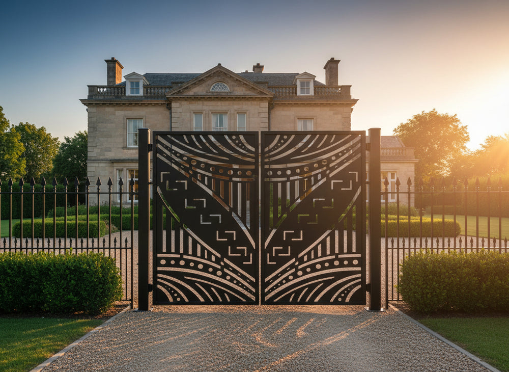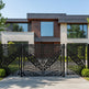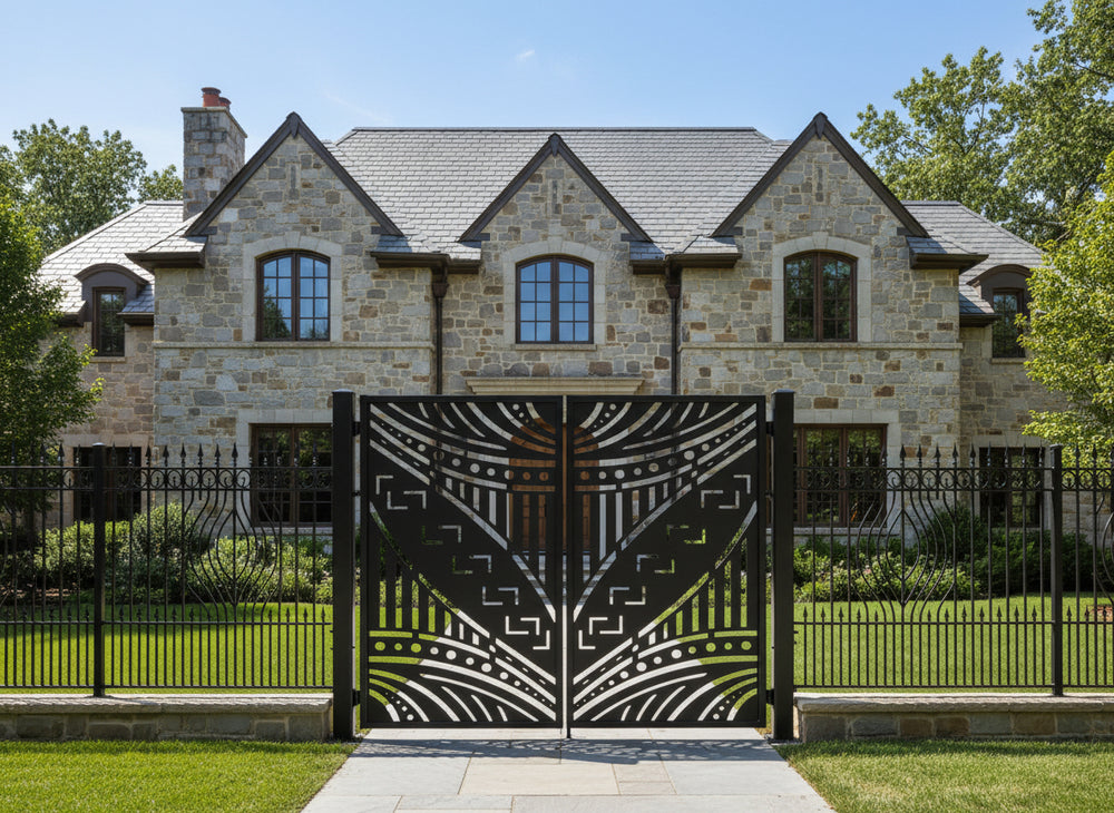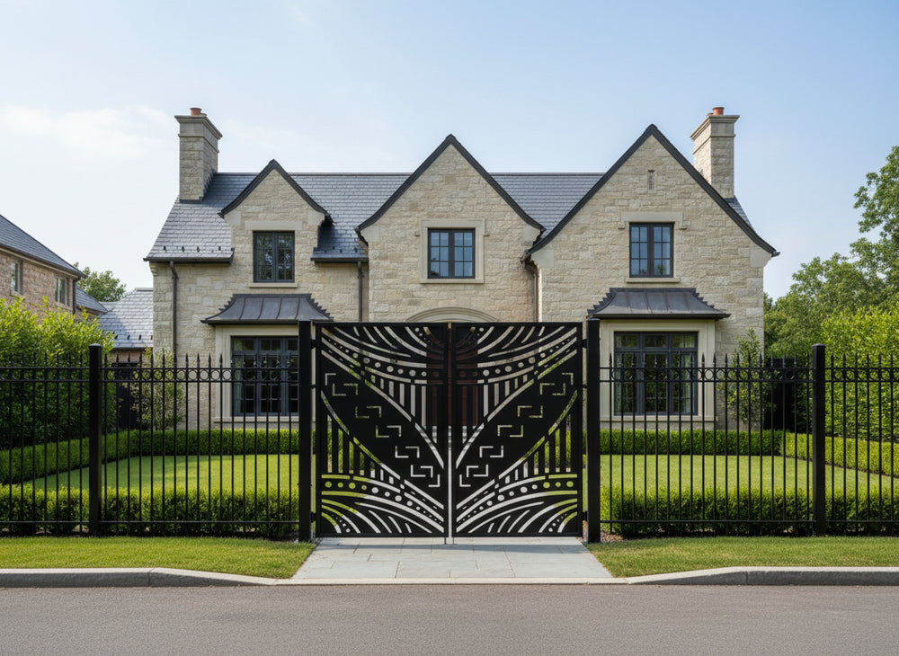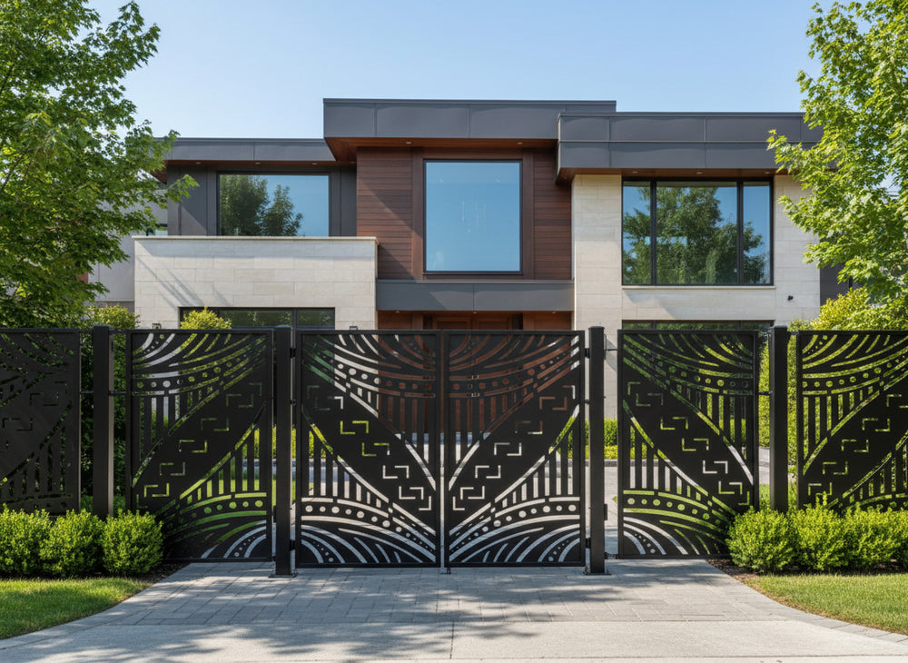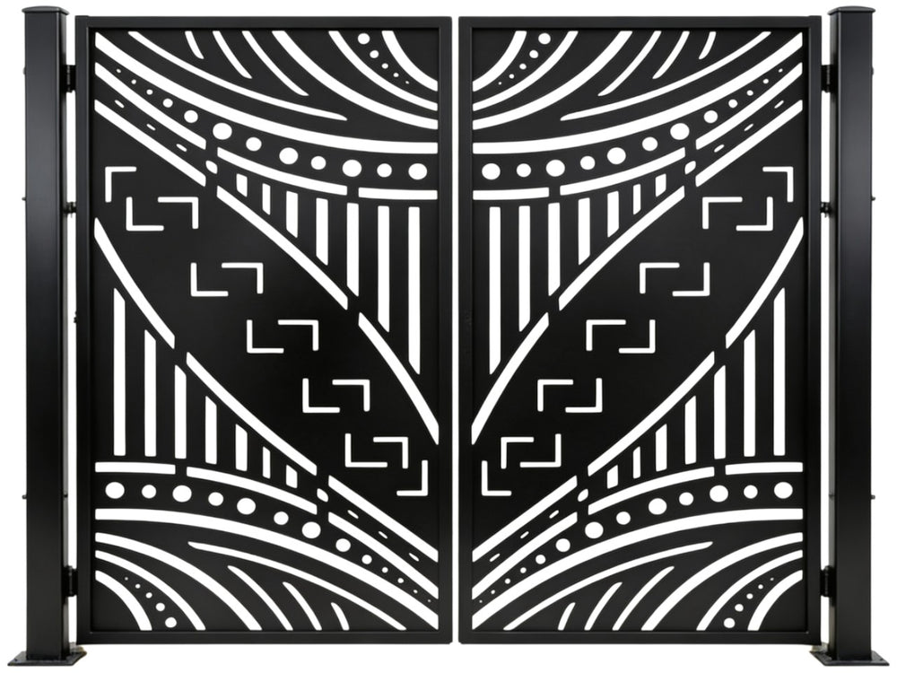 A door that blends nature and abstraction. Glyphveil Passage features two symmetrical panels framed in matte black, each showcasing a mirrored composition of curved lines, dots, and angular shapes. The laser-cut design evokes a sense of movement and symbolic depth, offering partial visibility and airflow while delivering bold visual impact. Ideal for garden entries, courtyard transitions, or boutique walkways, this man door merges artistic geometry with secure craftsmanship.