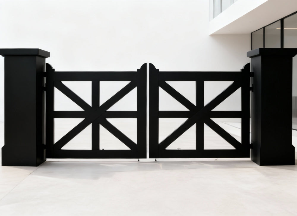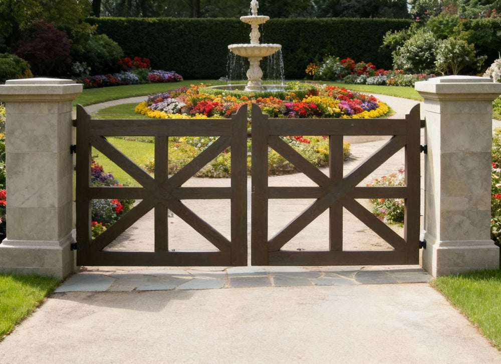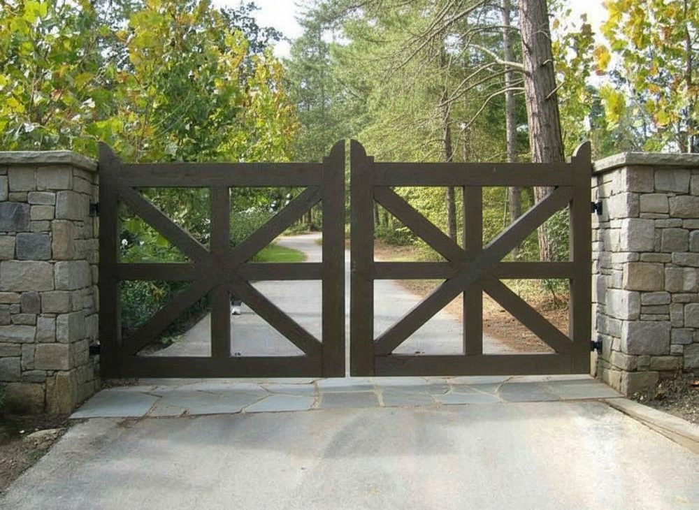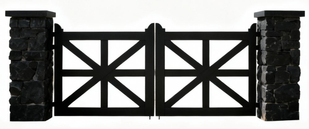 Make a confident entrance with Crossmark Estate, a double swing gate featuring symmetrical X-frame geometry, vertical bar reinforcement, and a matte black finish. Flanked by rugged stone pillars with flat caps and lantern mounts, this gate offers timeless strength and visual balance—perfect for properties that blend rustic textures with modern lines.