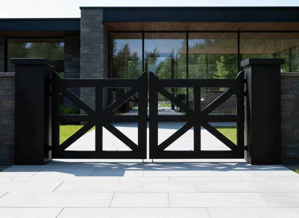 X-frame steel driveway gate, custom metal entrance gate, stone pillar gate design, Canadian handcrafted gate, rustic modern gate, heavy-duty decorative gate, architectural contrast gate
