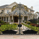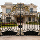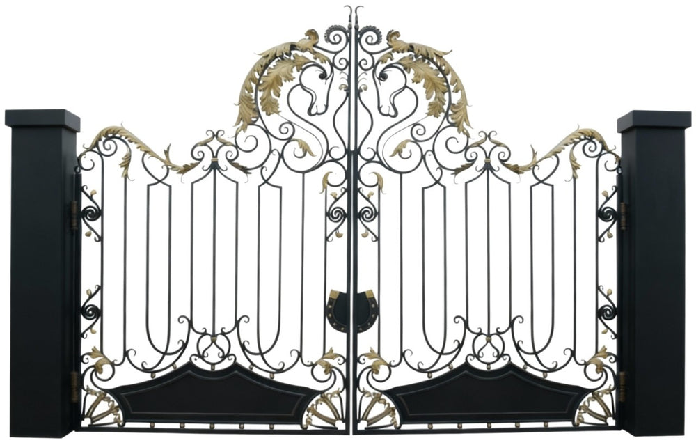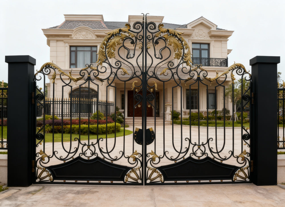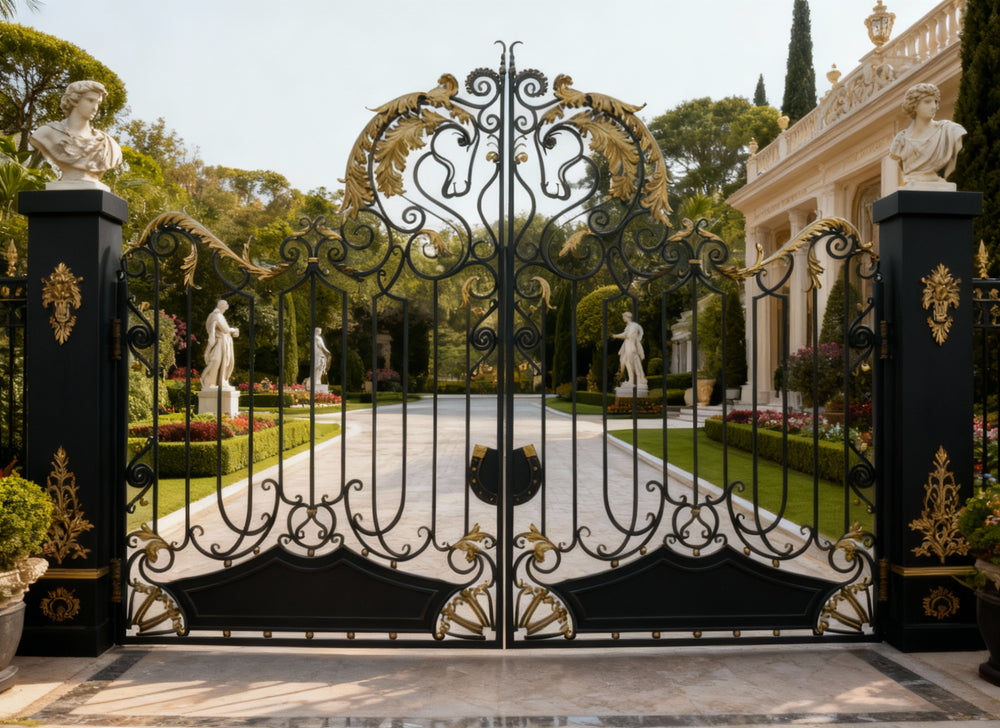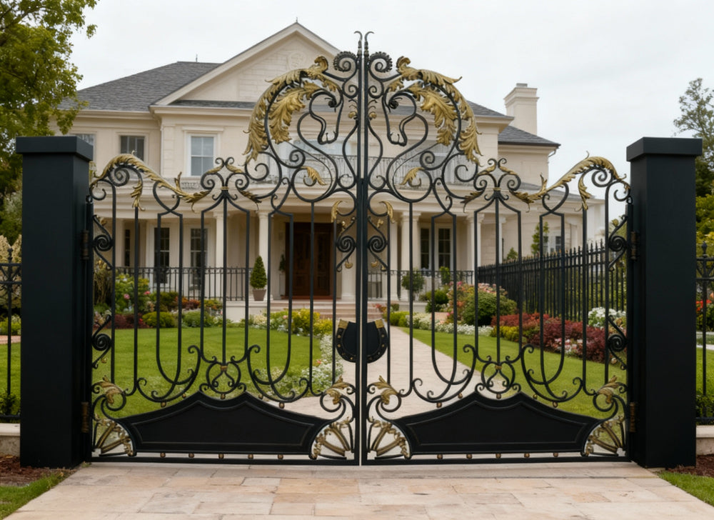 Ornamental wrought iron gate, luxury entrance gate, gold-accented security gate, decorative iron fencing, handcrafted iron gate, artistic metal gate, estate entry gate, custom wrought iron gates