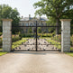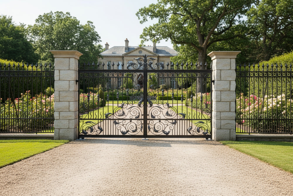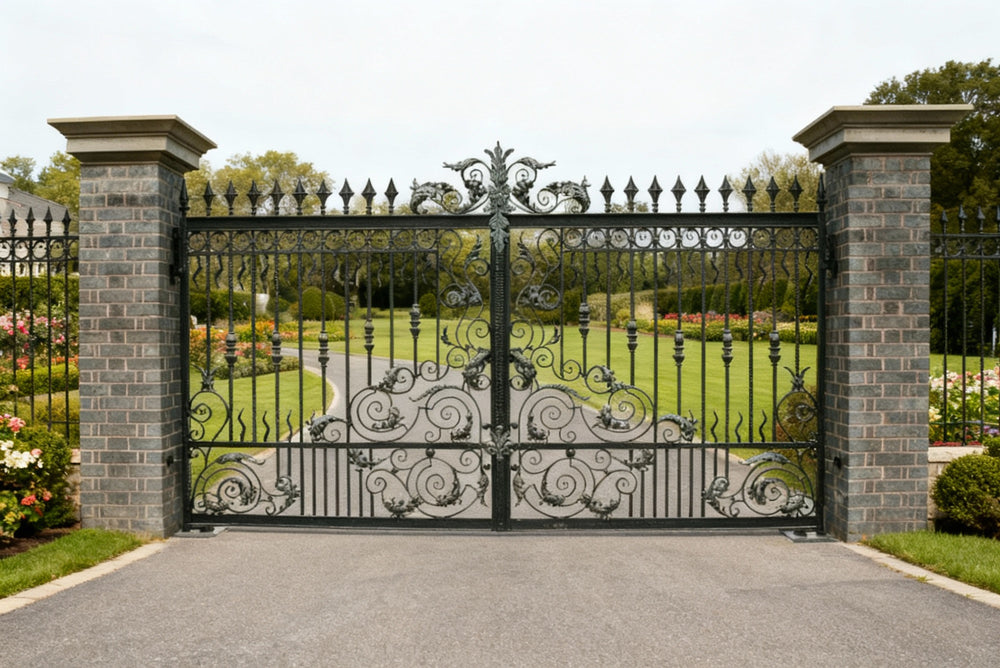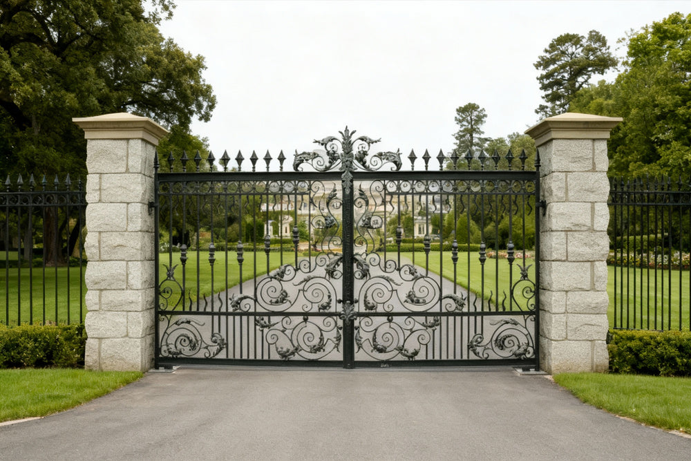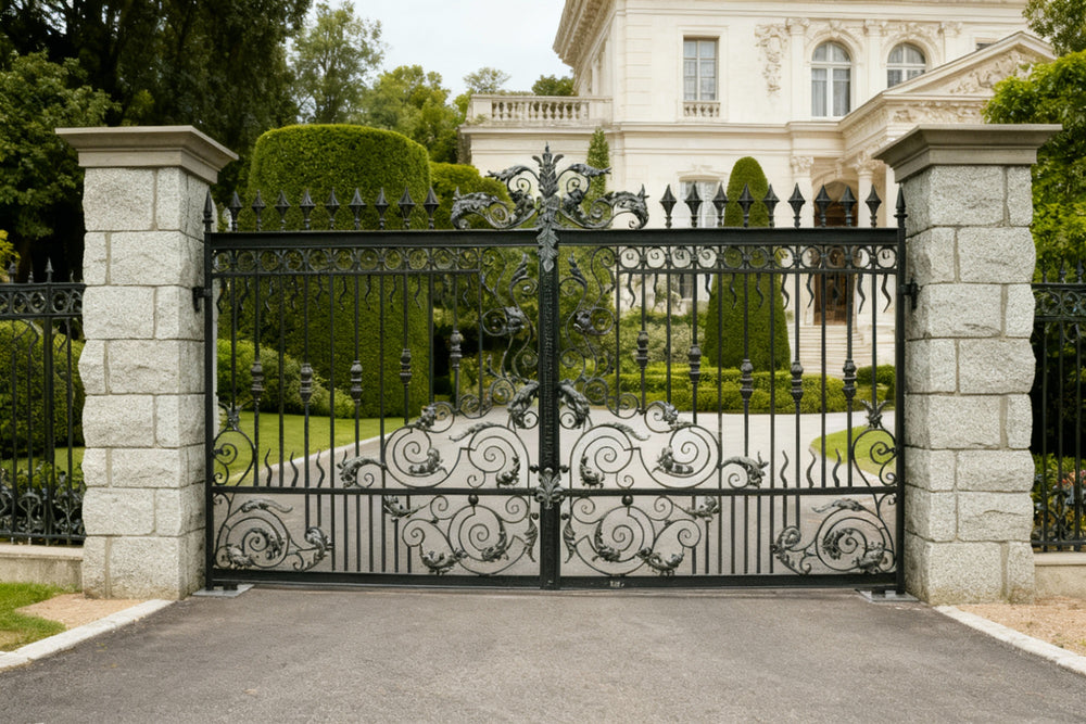 A gate that defines arrival with authority. Grand spire Estate Gate features dual swing panels adorned with intricate scrollwork and pointed finials, converging at a central crest that anchors the design in timeless prestige. Flanked by tall stone pillars with flat caps, the gate opens onto a manicured driveway leading to a stately mansion—framed by symmetry, serenity, and sculptural elegance.