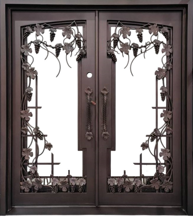 Model IWD 1042 offers a unique blend of rustic charm and artistic metalwork, featuring a double-door layout adorned with grapevine scrolls and sculpted grape leaf handles. Hand-forged from hot-dipped galvanized steel and finished with protective powder coating, the door boasts durability and timeless design. Behind the ornamental ironwork lies insulated glass that boosts thermal performance while allowing filtered light into the entryway. The square top silhouette and integrated kickplate underscore its balance of function and sophistication—ideal for vineyard estates, cottage-inspired homes, or elevated classical facades.