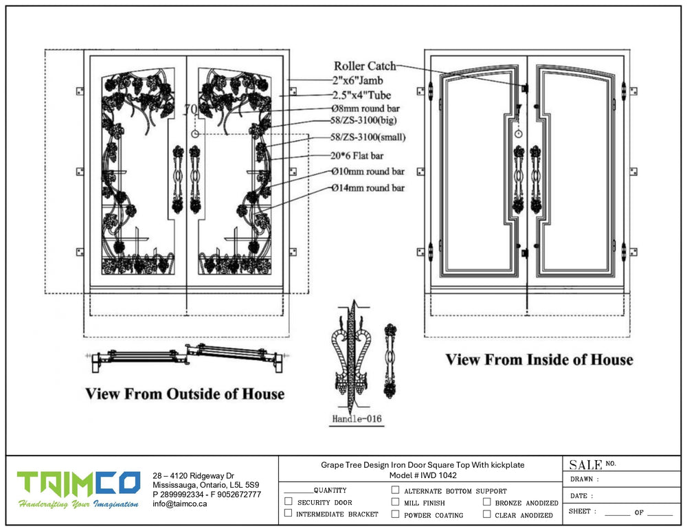 Grape vine iron door,Ornamental wrought iron entry door, Square top iron door with kickplate, Decorative iron front door, TAIMCO iron door IWD 1042, Grape tree design wrought iron door, Custom iron door with grapevine scrollwork, Powder-coated wrought iron entry door, Artistic metal door with square top, Handcrafted iron door with kickplate, Luxury iron door Canada, Exterior wrought iron door with design, Galvanized steel entry door, Customizable iron door for home, Elegant iron door with nature motif