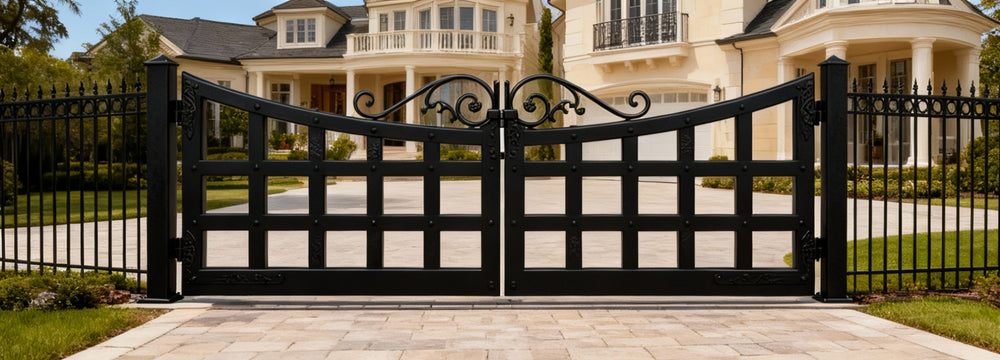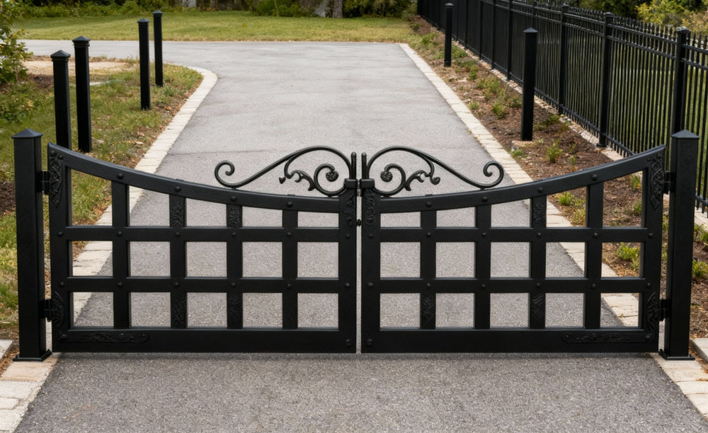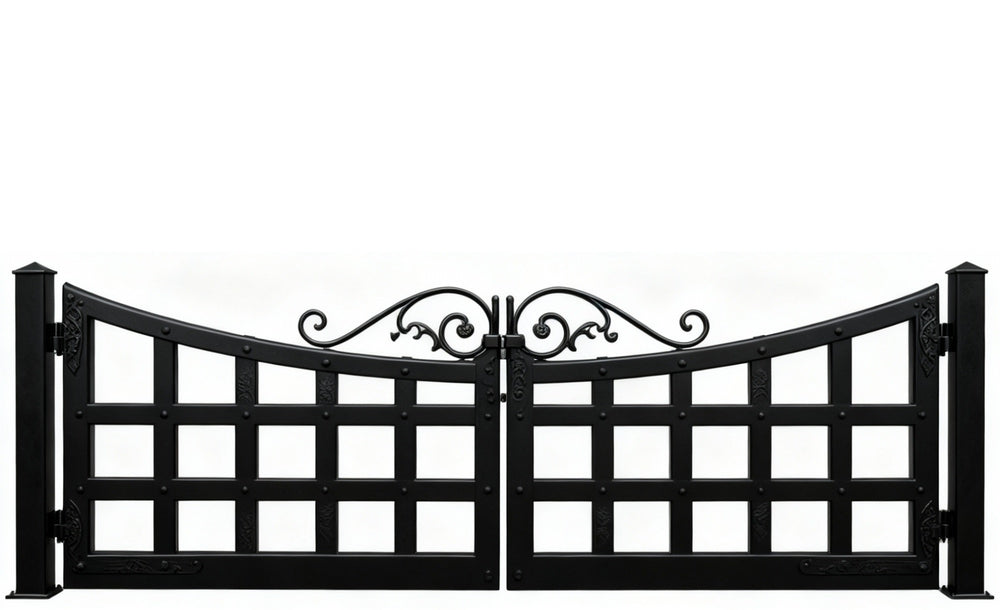 A gate that blends geometry with grace. Gridcrest Harmony features dual swing panels with a square grid layout, crowned by a gentle upward curve and a central scrollwork medallion. The symmetrical design offers both structural integrity and ornamental appeal, while the matte black finish and capped vertical posts create a clean, timeless silhouette. Perfect for homes that value balance, beauty, and durability.