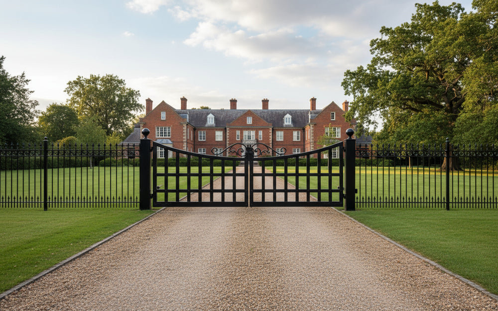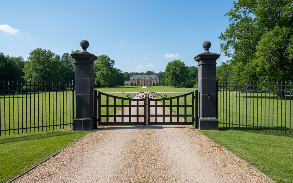 Grid pattern driveway gate, scrollwork wrought iron gate, custom steel entrance gate, Canadian luxury gate, Taimco decorative gate, symmetrical estate gate, heavy-duty artistic gate, formal home gate design