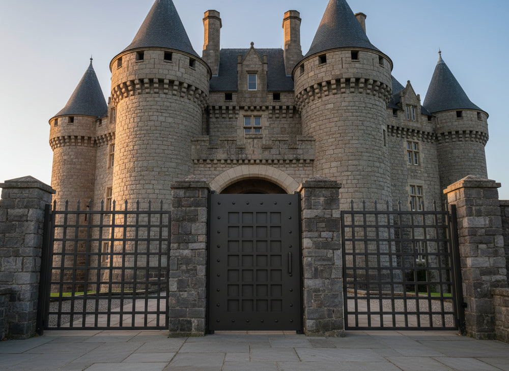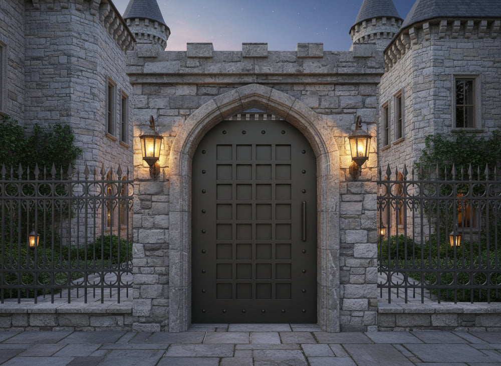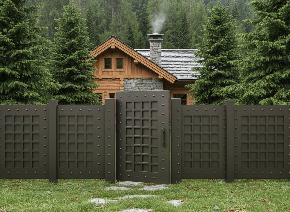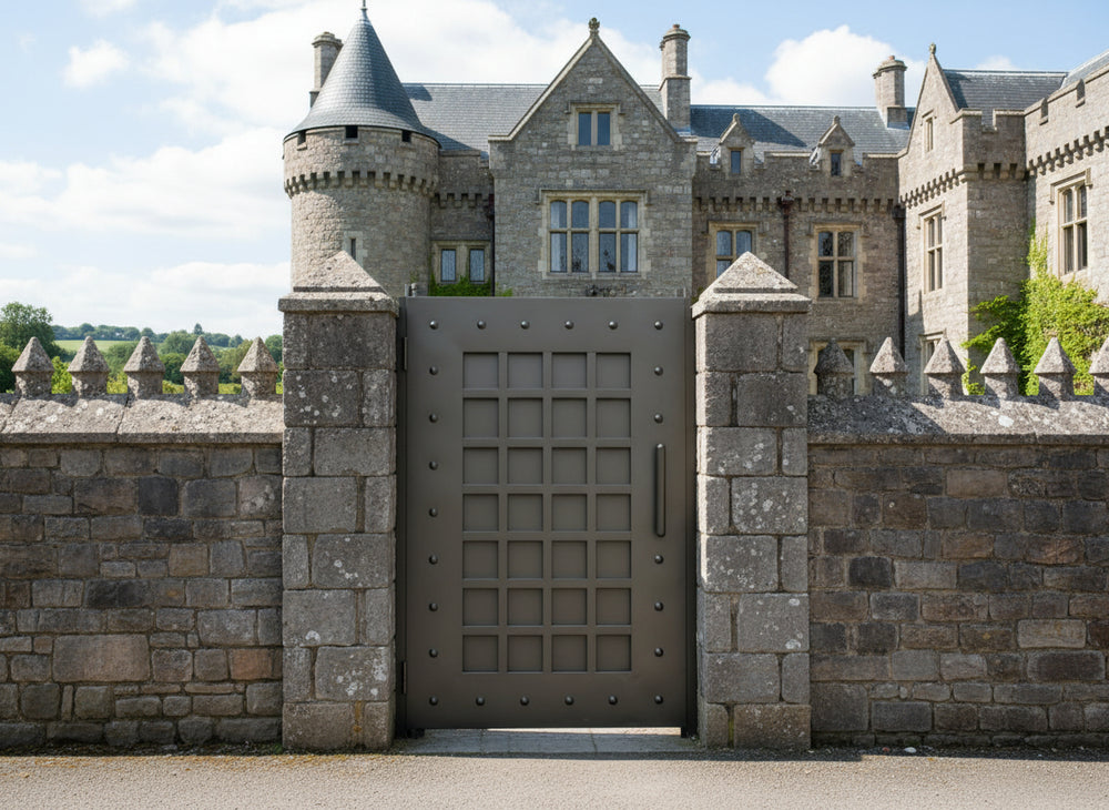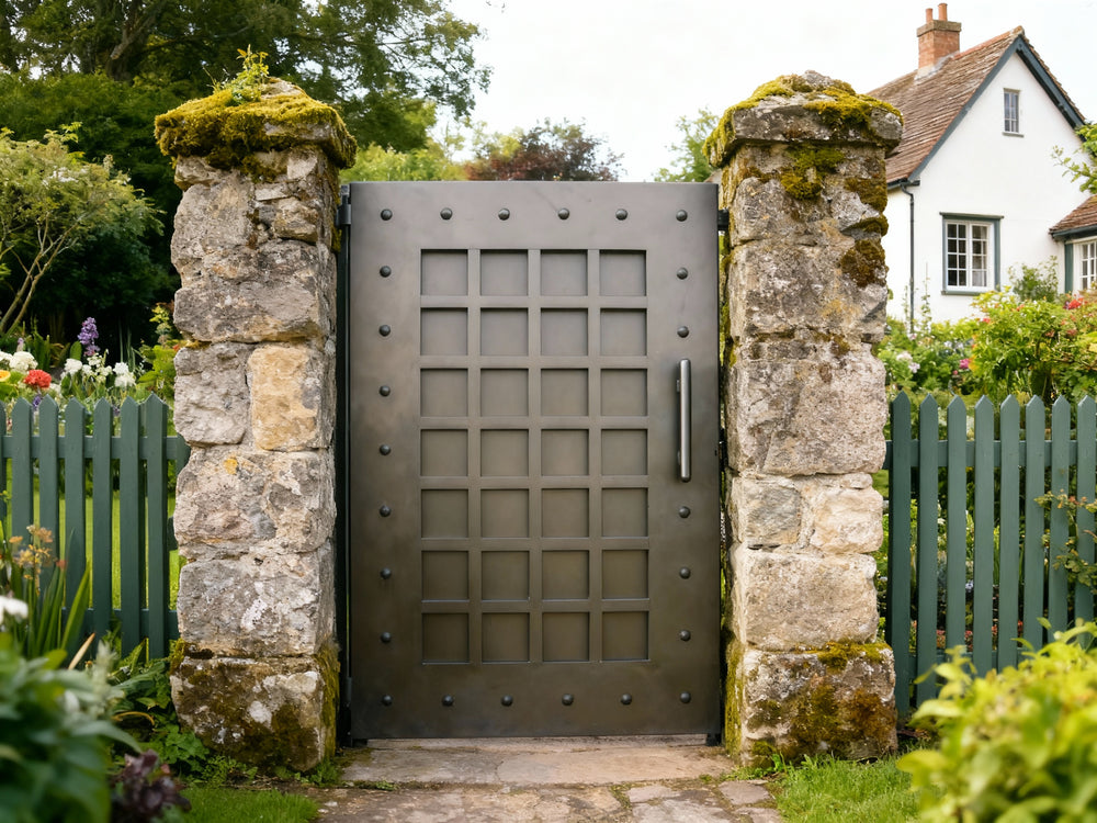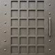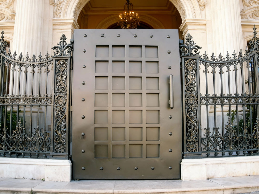 A door that evokes strength and symmetry. Gridmark Passage features a central grid of square panels bordered by a riveted frame, creating a fortress-like aesthetic with modern precision. The metallic finish and vertical handle reinforce its industrial character—ideal for alley entries, side passages, or architectural transitions that require both durability and visual impact.