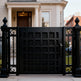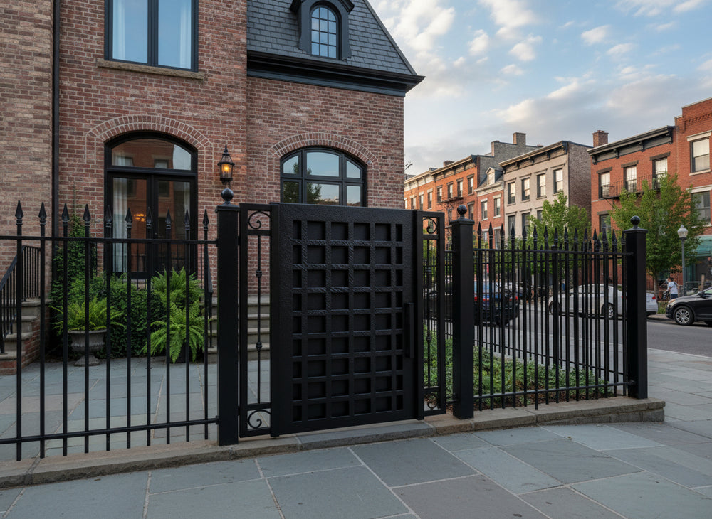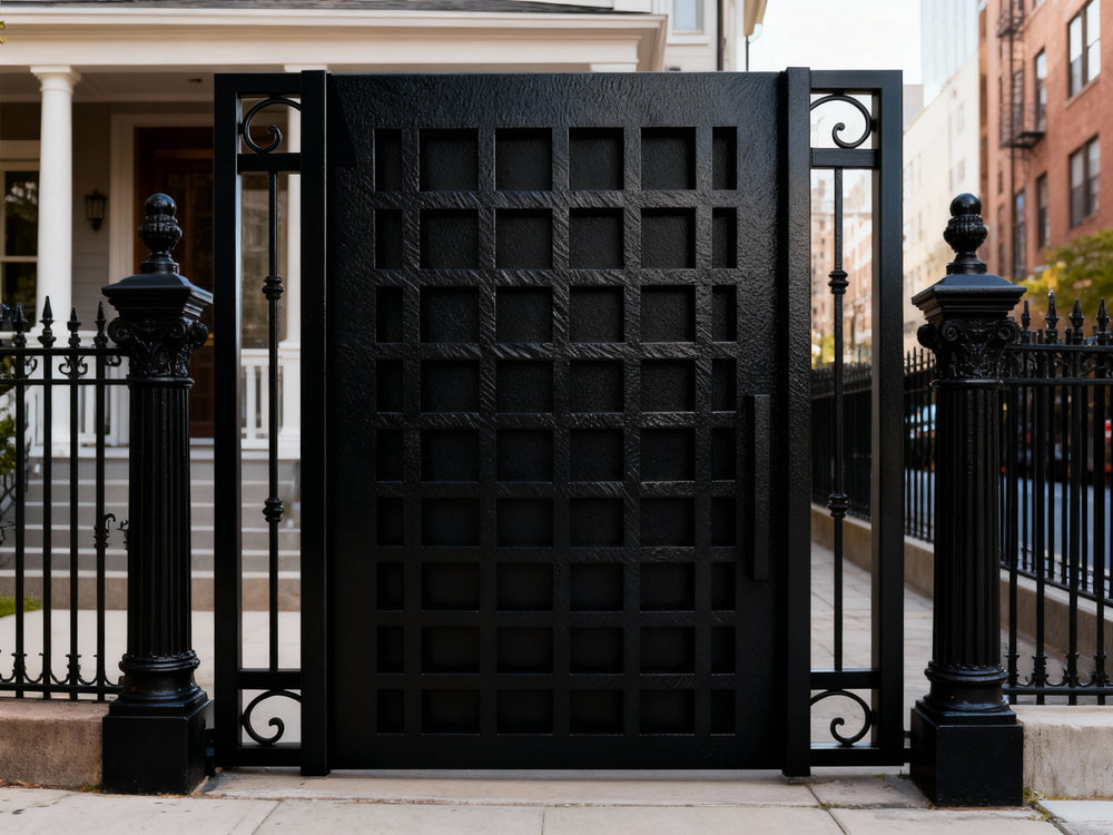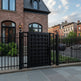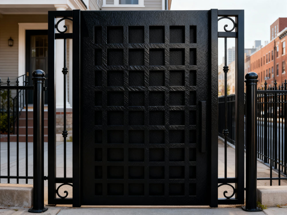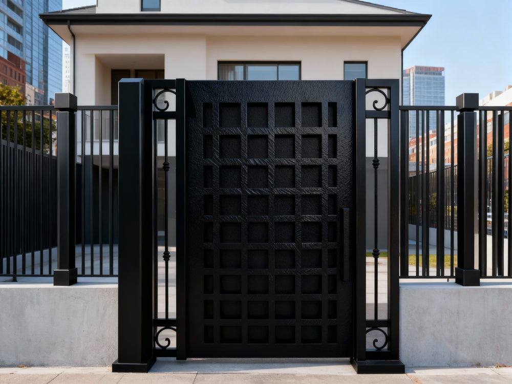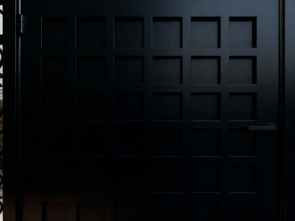 square grid man door, ornamental scroll metal gate, hybrid garden entry, Canadian custom gate, Taimco decorative passage door, manual operation estate gate
