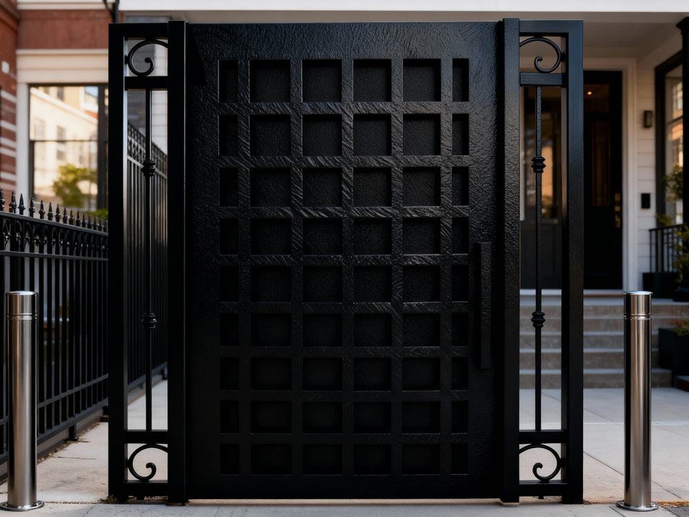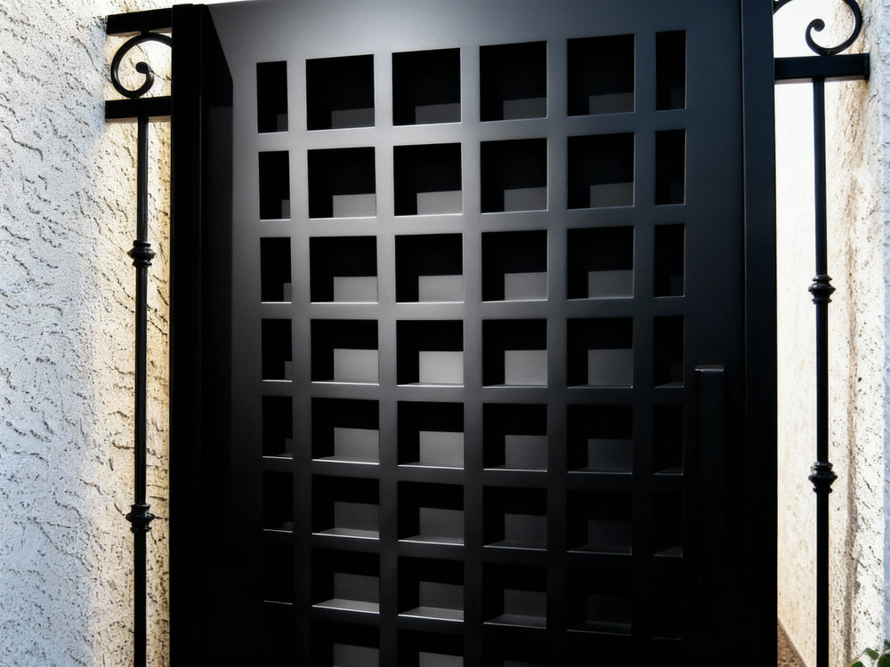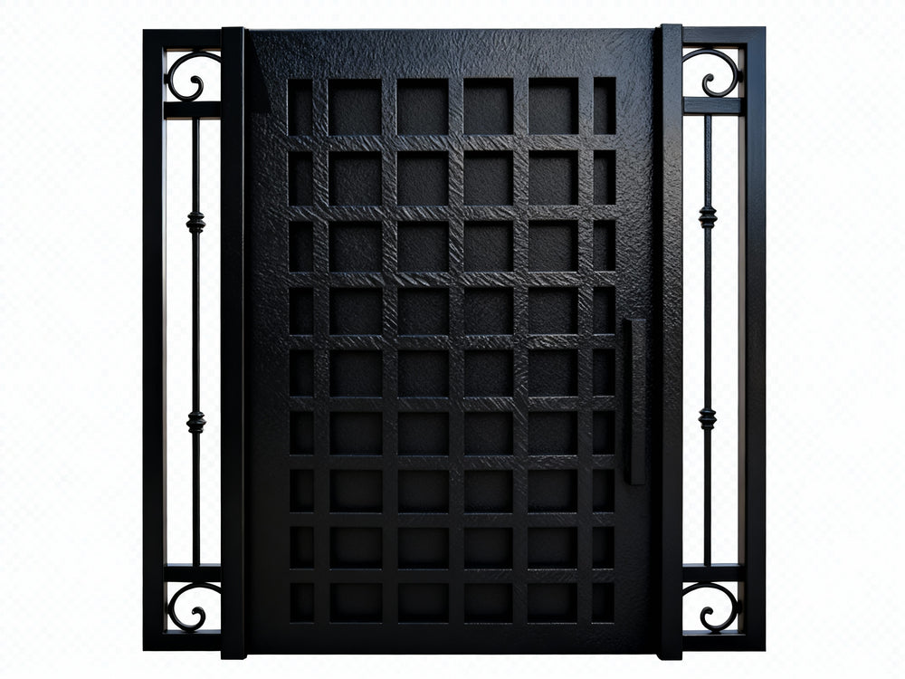 A door that balances order and ornament. Gridbloom Passage features a structured central panel composed of square grid geometry, flanked by two vertical panels of ornate scrollwork and floral motifs. This fusion of modern minimalism and classical elegance makes it ideal for upscale residential or commercial entries that demand both visual clarity and artistic richness.