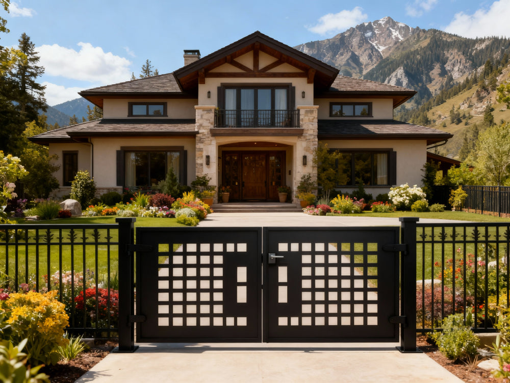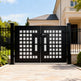 A gate that speaks in geometry and guards with precision. Gridform AxisGate features dual swing panels with a grid of rectangular cutouts arranged in a mirrored pattern. The left panel presents a five-column matrix, while the right panel echoes the design with a vertical trio at center—creating visual tension and balance. The matte black finish and clean lines evoke strength, clarity, and architectural rhythm—perfect for entrances that blend security with sculptural elegance.