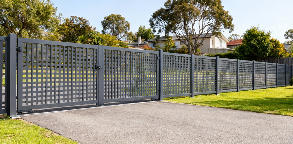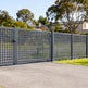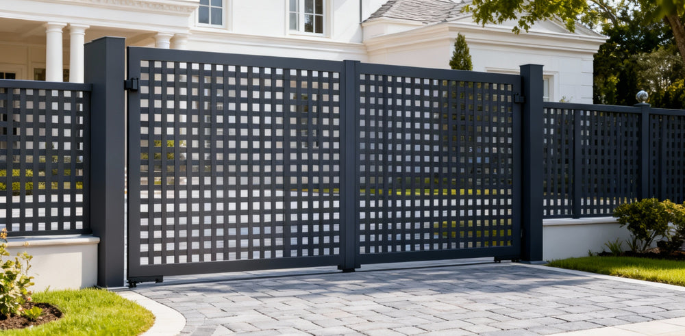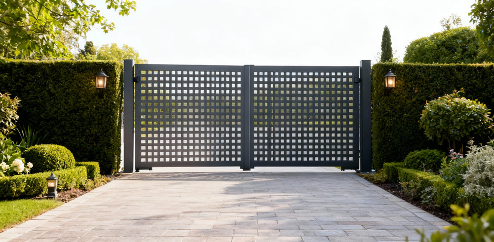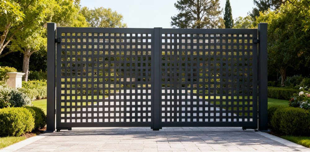 A gate that guards with precision. Gridform Axis features dual swing panels with a symmetrical grid of square openings, offering controlled visibility and architectural rhythm. The dark metal finish enhances its contemporary appeal, while the clean lines and central seam evoke strength and balance—perfect for properties that blend modern design with functional security.
