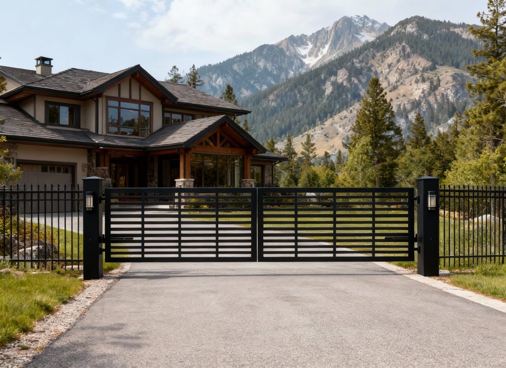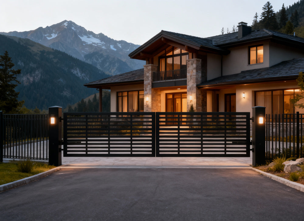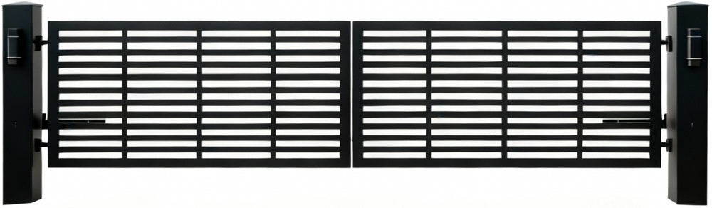 Make a bold architectural statement with Linear Vault, a dual-panel sliding gate system crafted from precision-aligned horizontal steel slats. Framed by four concrete pillars and accented with integrated lighting, this gate offers seamless security and minimalist elegance—perfect for modern homes, urban villas, or commercial compounds.