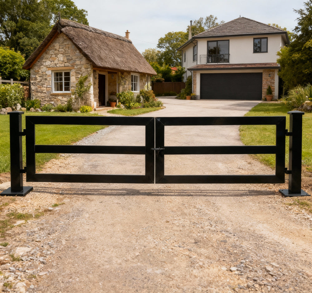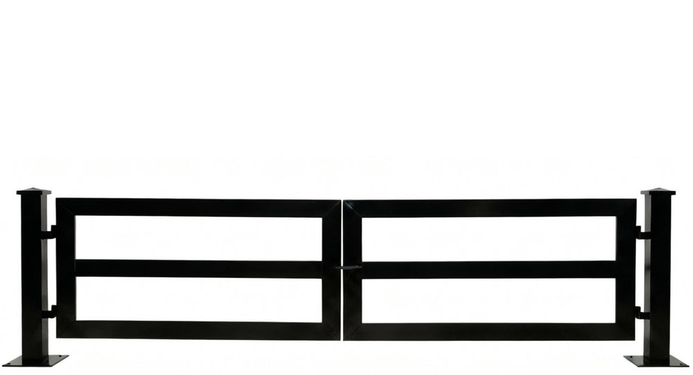 A gate that defines boundaries with quiet authority. Gridline Axis features dual swing panels composed of horizontal bars and vertical framing, forming a crisp rectangular silhouette. Mounted on square base plates, the gate’s posts offer stability and modular integration with fencing systems or architectural facades. This design evokes strength, simplicity, and modern utility—perfect for driveways, courtyards, or perimeter control.
