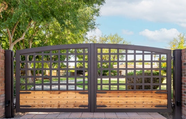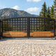Set between stone pillars and surrounded by lush landscaping, this gate transforms your entrance into a statement of strength and style.